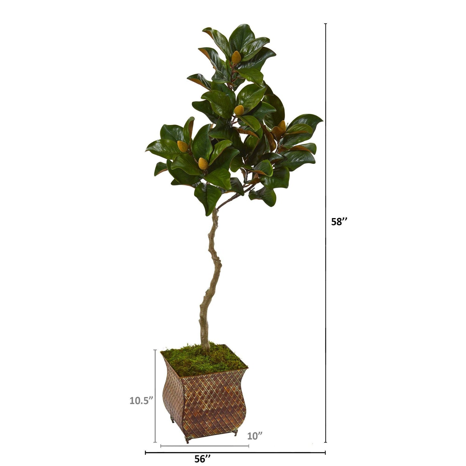 Showcase hints of the old south with this artificial magnolia leaf tree made up of realistic looking glossy leaves in bright green hues, highlighted throughout with realistic looking buds. Standing 58” tall from a metal planter, this silk tree will effortlessly complement existing decor.