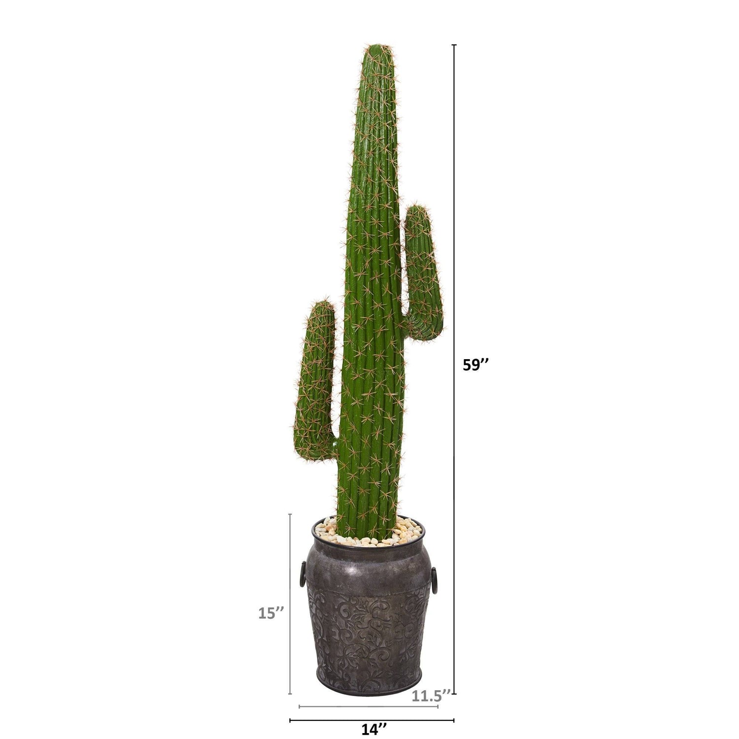 Use texture to transform tight spaces with this artificial plant boasting a single cactus designed with such realistic color and naturally occurring details that guests will find it hard to believe it’s not real. Standing 59” high from a metal planter accented with natural tone rocks, this fake plant brings the desert’s tranquility indoors without the need for maintenance or upkeep.