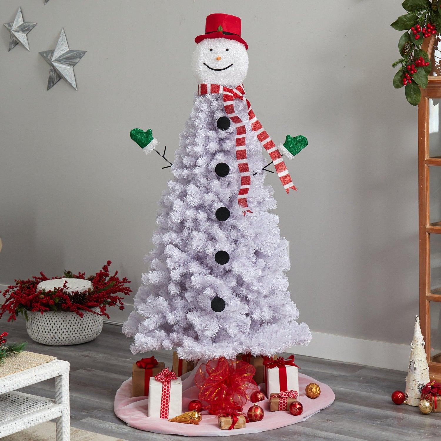 Do you dream of a white Christmas? Are the kids always trying to create snowmen? If yes, you will faux in love with this Snowman Artificial Christmas tree. Assembled from high-quality materials, this whimsical Christmas tree has a sturdy construction, upward-facing 408 bendable white PVC branches that can house any ornaments safely. Adorned with a hat, gloves, mittens, and a scarf, add any decorations to this bare snowman or none at all. Standing 6 5' house in a kids room or somewhere that needs holiday cheer. We guarantee it will make anyone smile.