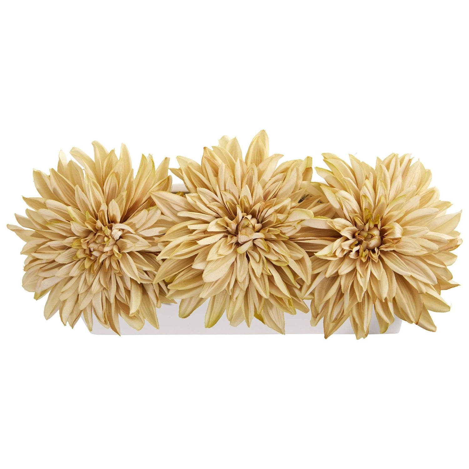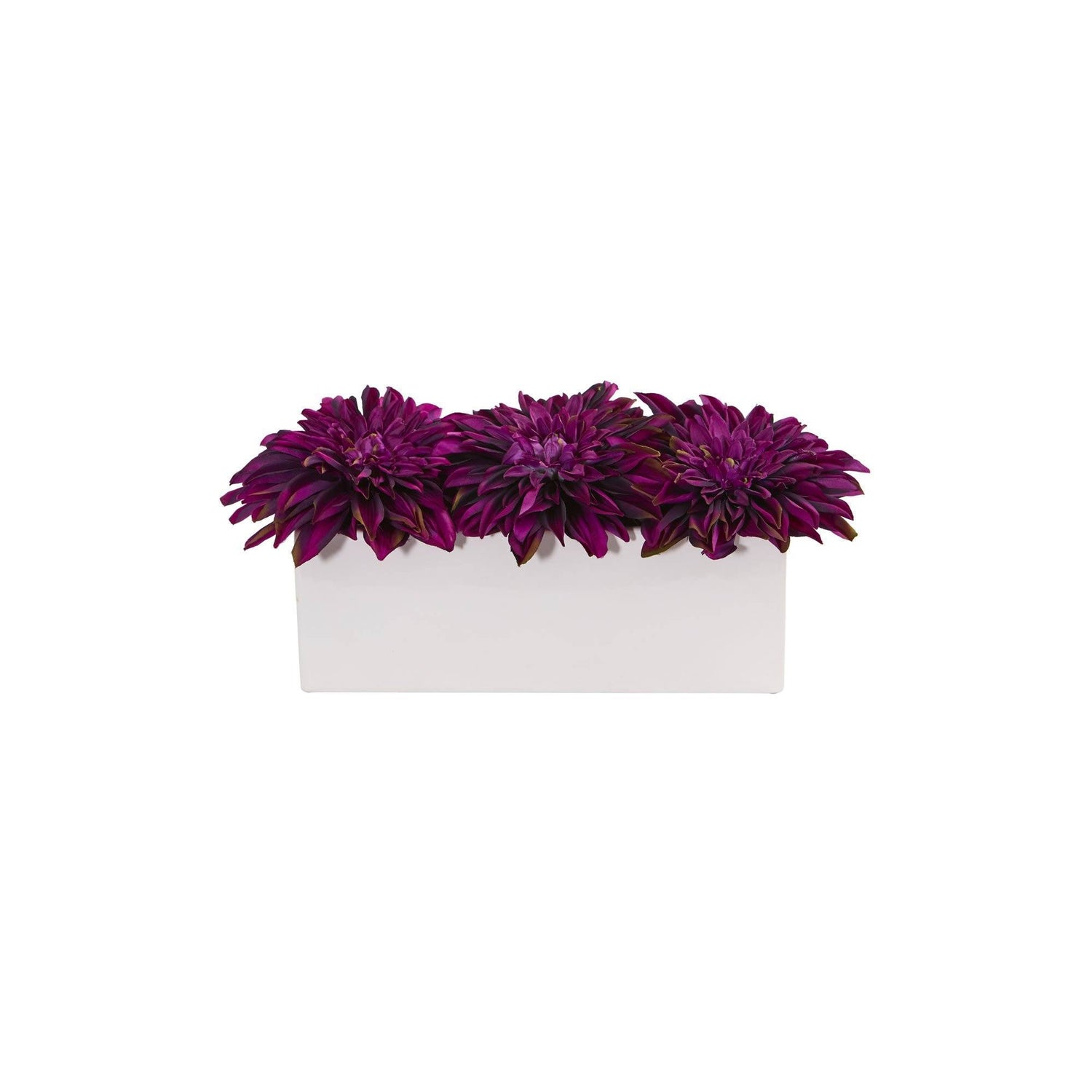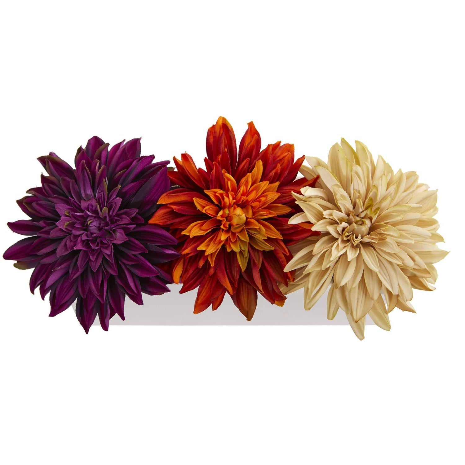 Three heads of fresh-looking beautiful flowers expand over the top of the included white planter of this artificial dahlia arrangement. Its dramatic foliage will look great on its own. Or, you can pair this cheery arrangement with scented candles and a stack of your favorite books to give your space a sophisticated update.