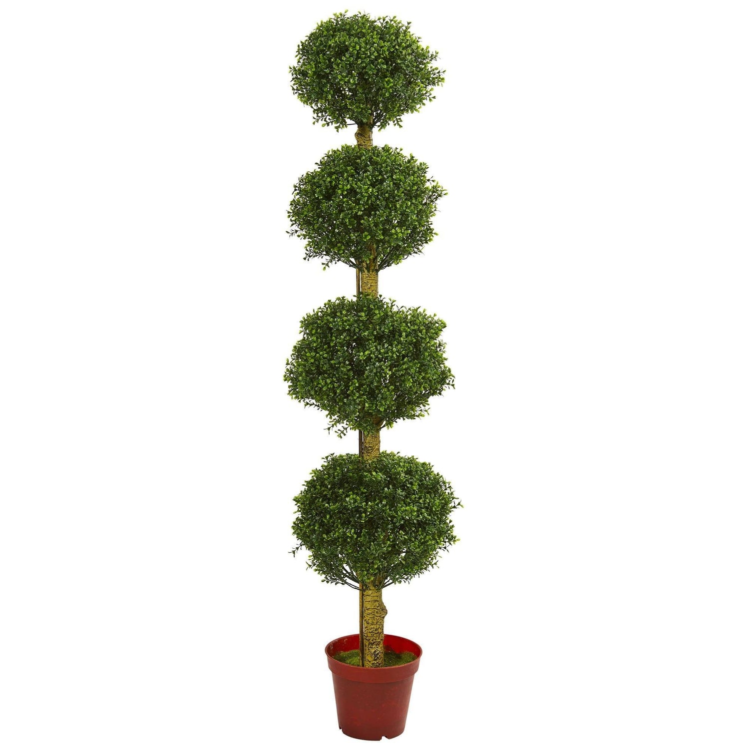 The 6’ artificial boxwood tree contains four spheres. Starting from the top, the fullness of the topiary gradually increase in size as they move down the stalk. It's UV-resistant leaves allow for it to be displayed outside in a garden or just near a window.
