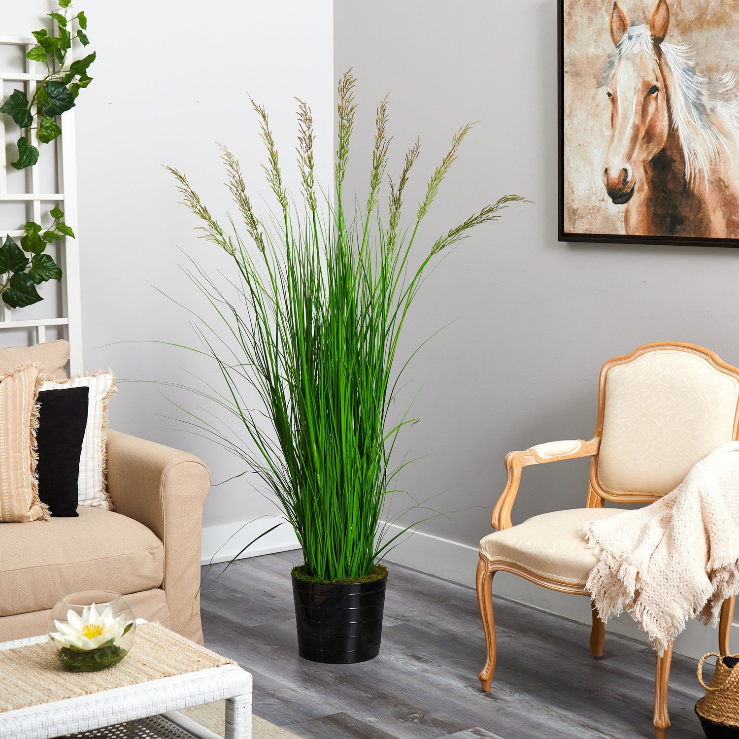 Complete your refined space with this grass artificial plant. A fountain of foliage sprouts different sized grass blades, featuring different light hues, ranging from yellow, red, and orange. Incredibly lifelike, curate in spaces that need color, texture, and depth. Standing 6' from a black tin planter (included in height), make a statement in areas that need some greenery. Curate with plants and flowers of different textures such as Mixed greens and sweetgrass bush.
