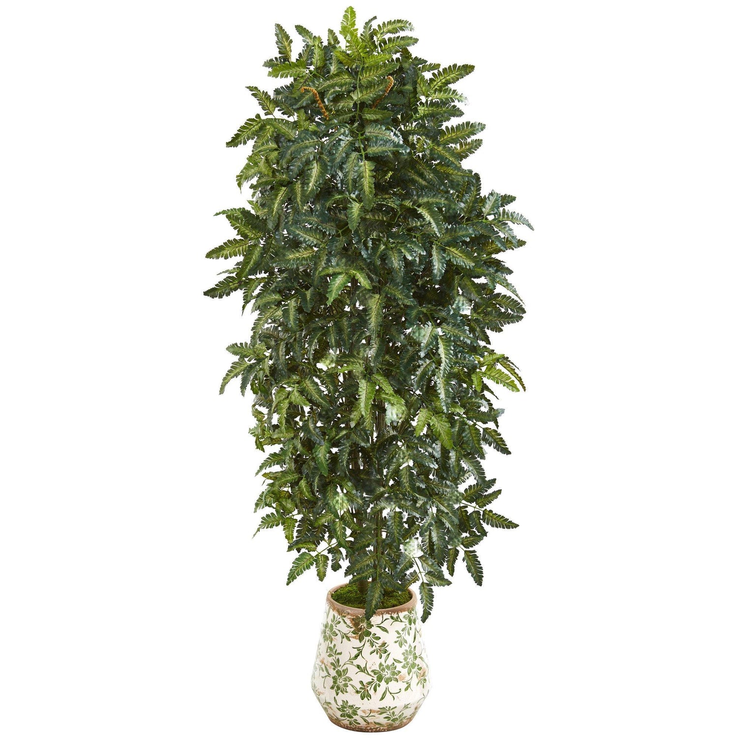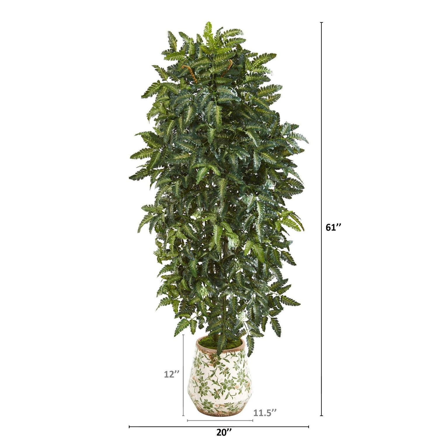 Add instant greenery to your home or office with this artificial bracken fern plant showcasing a collection of variegated leaves in naturally occurring hues. Standing 61” high from a vintage floral planter, this silk plant is designed to look as natural as the real thing.