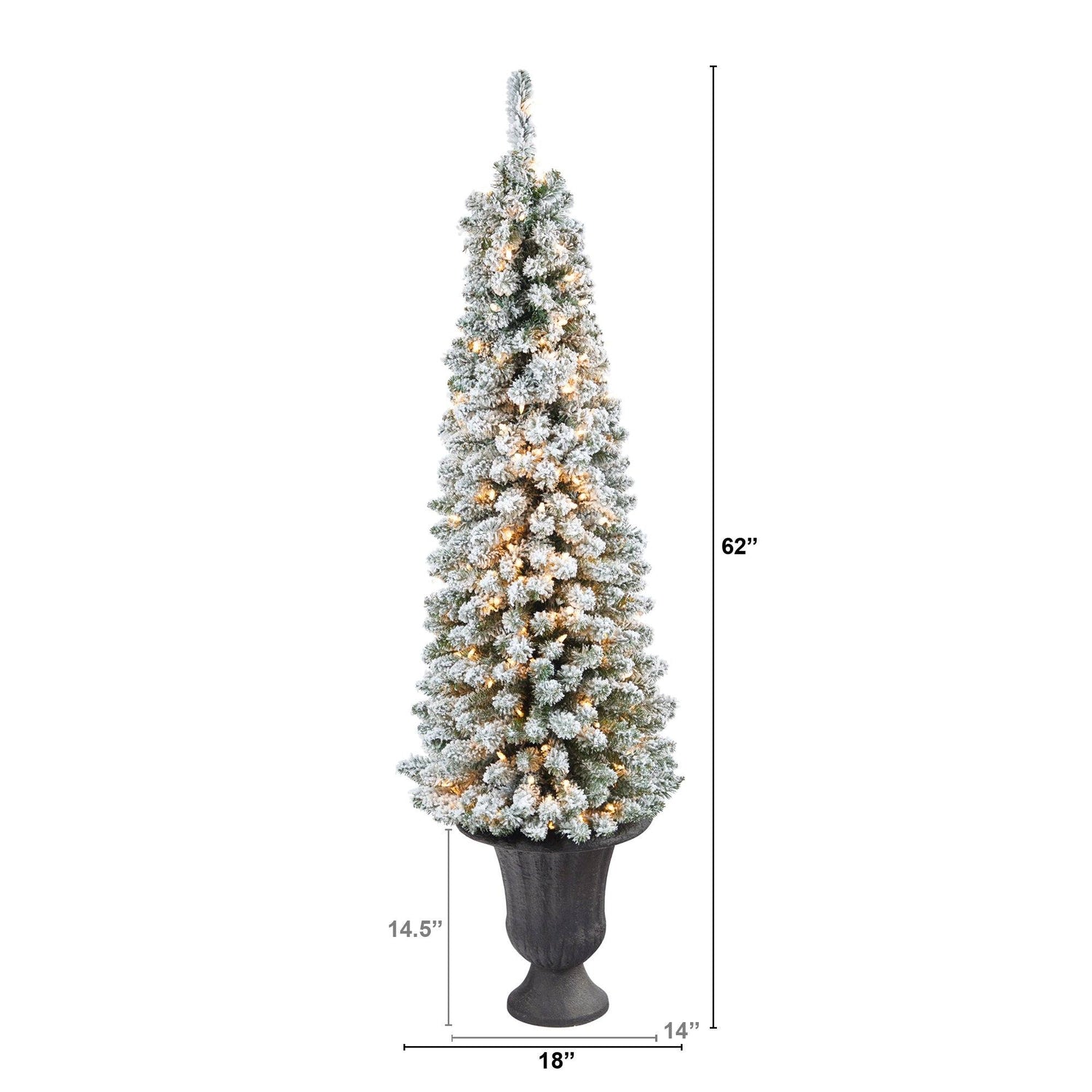 Tight areas deserve some Christmas cheer too. Decorate slim and small spaces such as foyers, corners and apartments with this flocked Pencil Artificial Christmas Tree. Designed by our interior decorators using the highest-quality materials – this incredibly lifelike tree mimics the spectacular foliage and texture of real trees – elegantly decorate the 318 easy-to-bend branches with your favorite mini-ornaments. Arriving pre-strung with 200 clear lights that creates that holiday glow. Standing at 62” from a charcoal urn(included in height), spruce up even the tightest spaces.