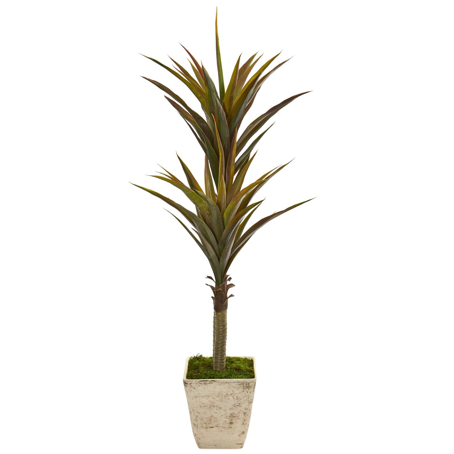 Add natural greenery to freshen up everyday spaces with this artificial yucca tree containing two textured trunks, each boasting realistically designed leaves that fan naturally upwards in bright green hues. Standing 63” high from a country-inspired white planter, this maintenance-free silk plant can help freshen up a home or office.