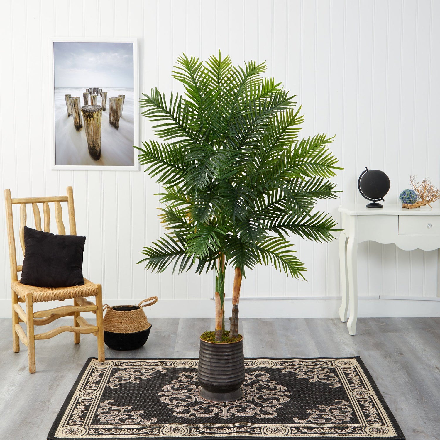 Make and shake a splash with this green fountain full of leaves, greeting your home like its summer all year. Designed to recreate your favorite seaside shore adventures, glee with feather-like, thick variegated, arching palm leaves that stem from 3 matured mixed colored trunks. Standing 64" from a ribbed metal planter, place in your room corners, office, or bedroom for some freshness. Perfect for all décor styles that need some greenery.