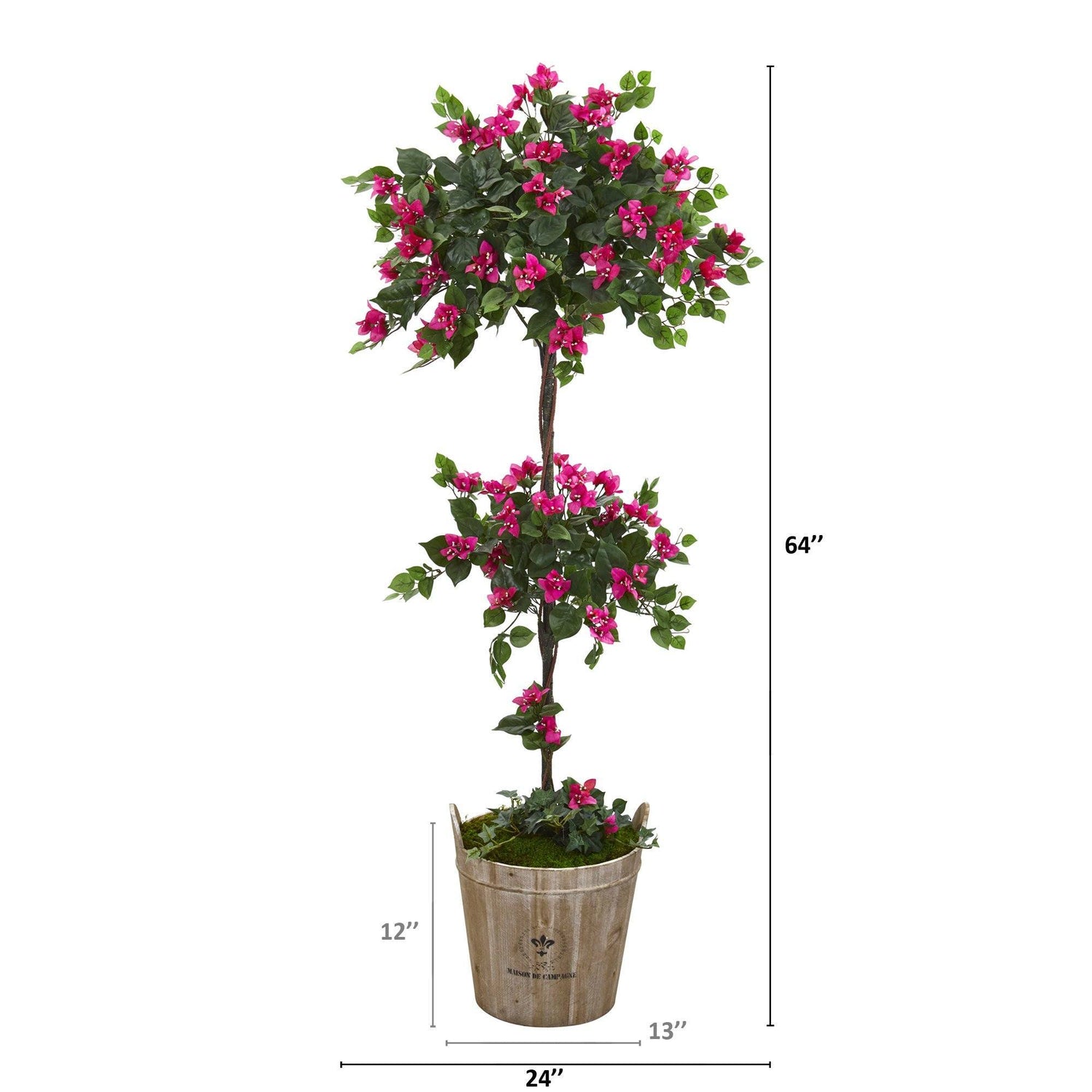 Incorporate bright, long-lasting color throughout your home or office with the help of this artificial topiary tree boasting three levels of plentiful foliage, beautifully accented with a plethora of intricately designed bougainvillea blossoms in eye-catching hues and highlighted throughout with evergreen foliage. Standing 64” high from a farmhouse planter, this decorative topiary tree will create instant freshness wherever displayed.
