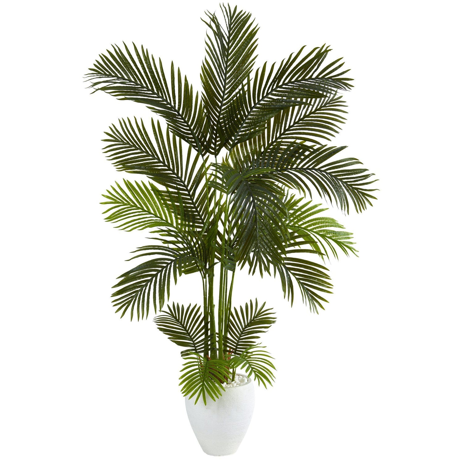 Freshen up bare spaces throughout your home or office with the help of this artificial tree boasting a rich overgrowth of realistic areca palm foliage that naturally fans up and outwards with a lifelike quality. Standing 65” tall from a white planter, this impressive fake plant will provide year-round freshness wherever you display it.