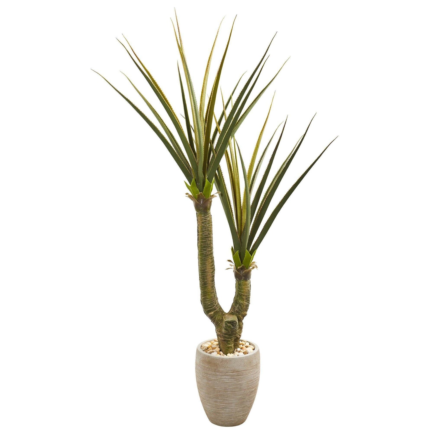 Beautify your home with year round greenery with the help of this artificial yucca plant containing two sturdy shoots of realistic greenery stemming from a single textured trunk. Nestled in a sandstone planter accented with natural tone rocks, this 68” tall plant can freshen up a space instantly.