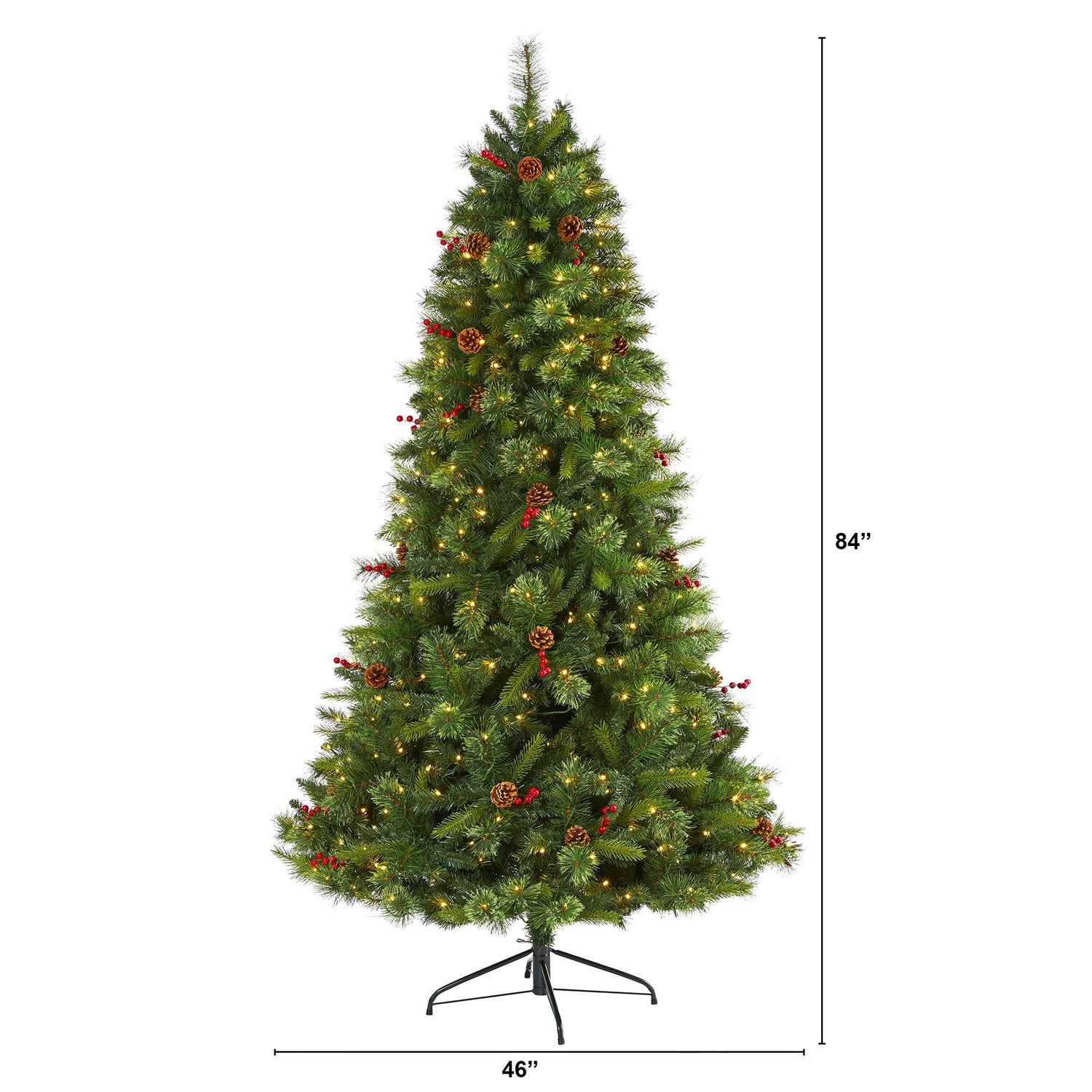 Create a picture-perfect Christmas setting in your home or office with this evergreen artificial Christmas tree. Easy and effortless, this artificial Christmas tree boasts a traditional silhouette of seasonal foliage made up of easy-to-bend branches, accented throughout with faux pinecones and holly berries - all of which looks incredibly realistic. Arriving pre-strung with 500 clear LED lights to eliminate unsightly tangles and carefully stabilized on a metal stand, this joyous 7’ artificial Christmas tree will complement a range of holiday decor schemes, year after year.