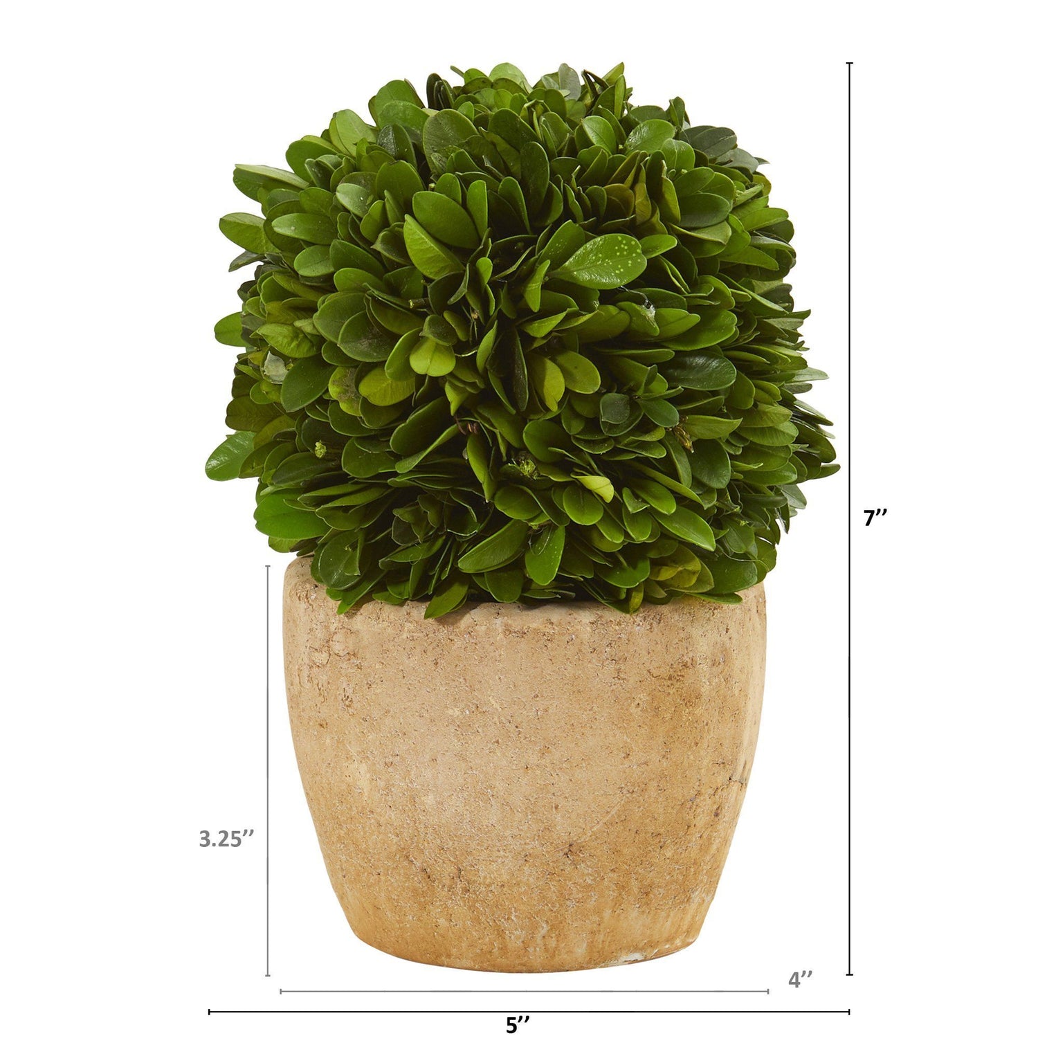 Enhance even the smallest of spaces with this set of preserved boxwood plants, each showcasing a single ball, perfectly manicured and designed with realistic boxwood foliage in bright, vivid hues. Arrives in a set of two and each sprouting 7” high from individual decorative planters, these preserved plants can easily be displayed singularly or collectively throughout a space.