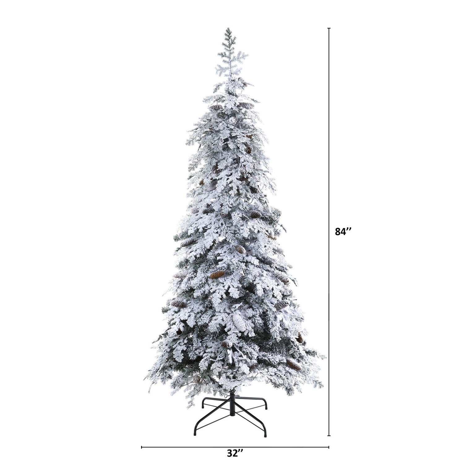 Create the ultimate winter wonderland scene in your home or office with the help of this flocked artificial Christmas tree! Completely maintenance-free, this winter-inspired fake Christmas tree boasts an array of soft looking foliage, all beautifully flocked in a snow-like effect throughout 565 bendable branches, perfect for accenting with holiday accents, and accented with faux pinecones that look incredibly lifelike. Arriving pre-strung with 400 LED lights to eliminate tangles and stabilized on a metal stand, this picture-perfect 7’ tall artificial Christmas tree will not only make holiday decorating a breeze but ensure your home is always looking picture-perfect throughout the holiday season.