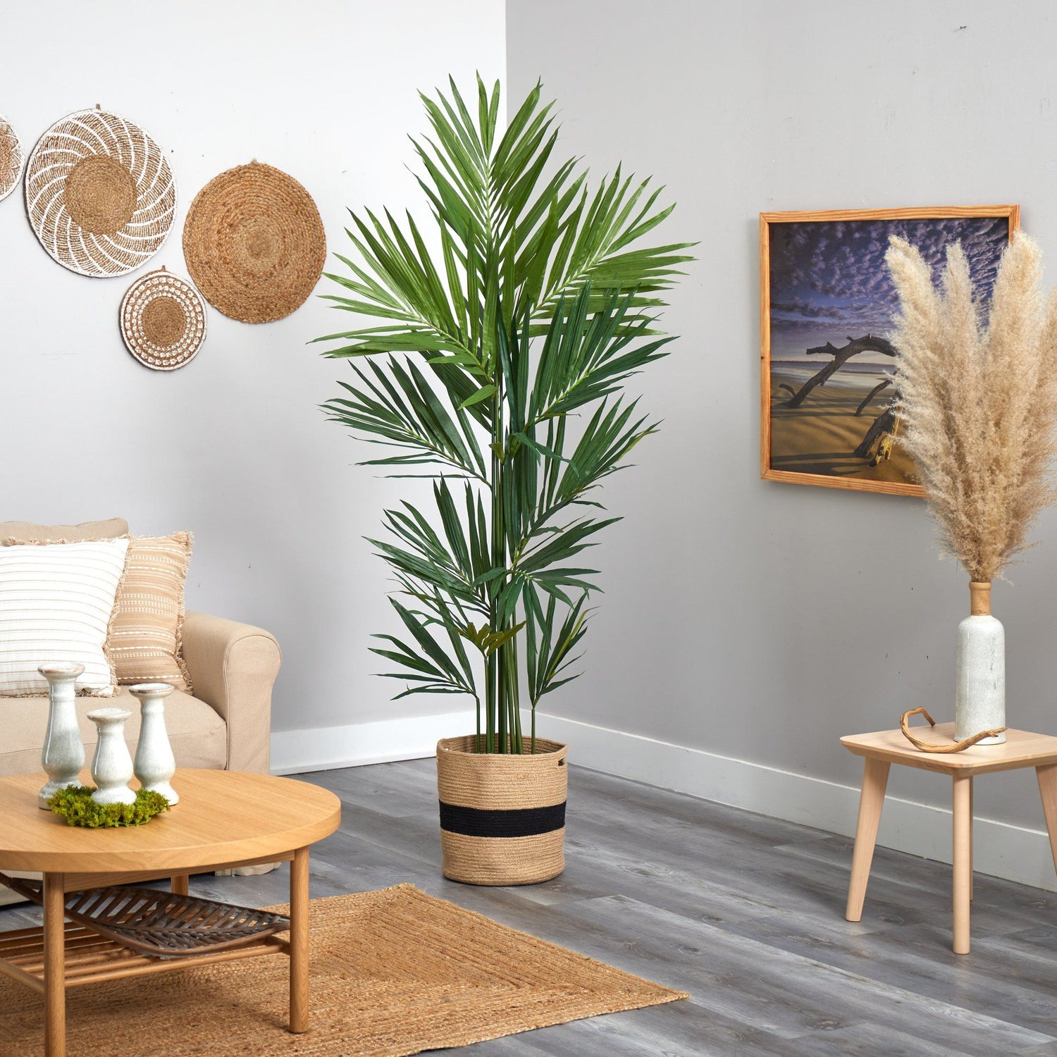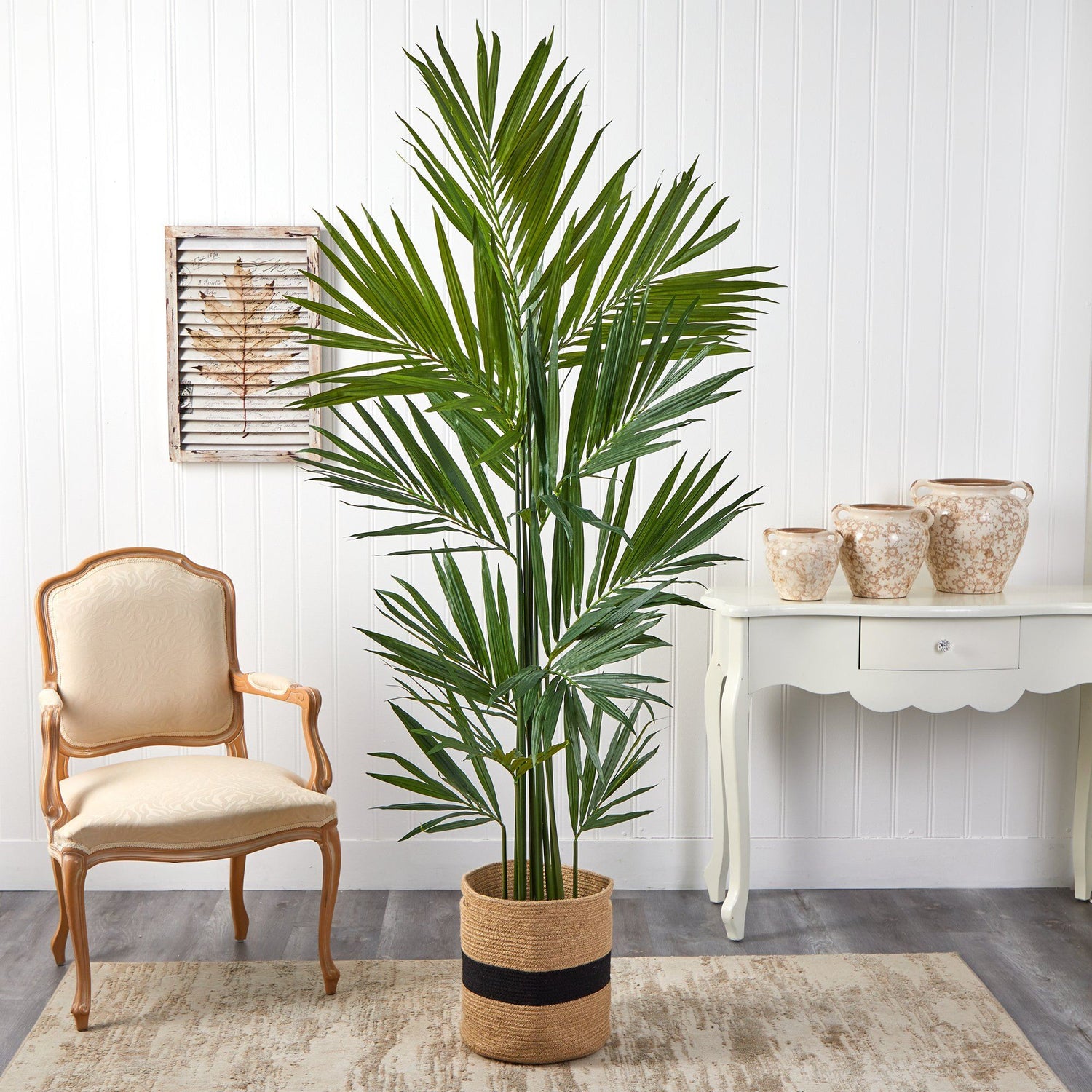 Bring clean lines and color to your living areas with this Kentia Artificial Palm. Native to Australia, these palms offer a more refined look than other palms while injecting greenery in any space. Assembled from high-quality materials, curate in any large area that needs a tropical refresh. Standing 7' from a cotton woven planter (included in height), transform your rooms. Perfect for a living room, bedroom corner, or lonely areas.