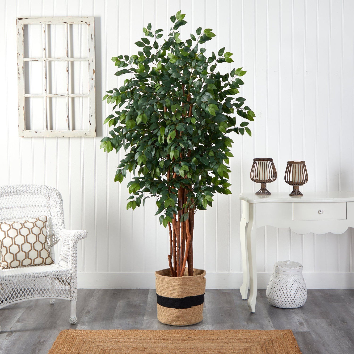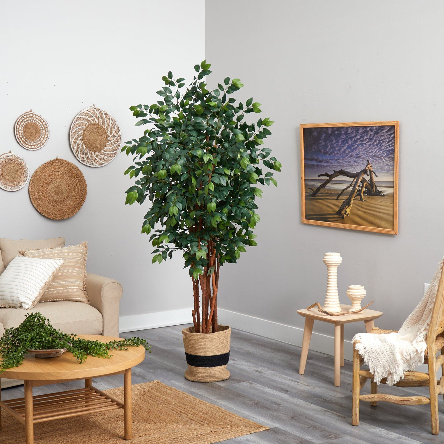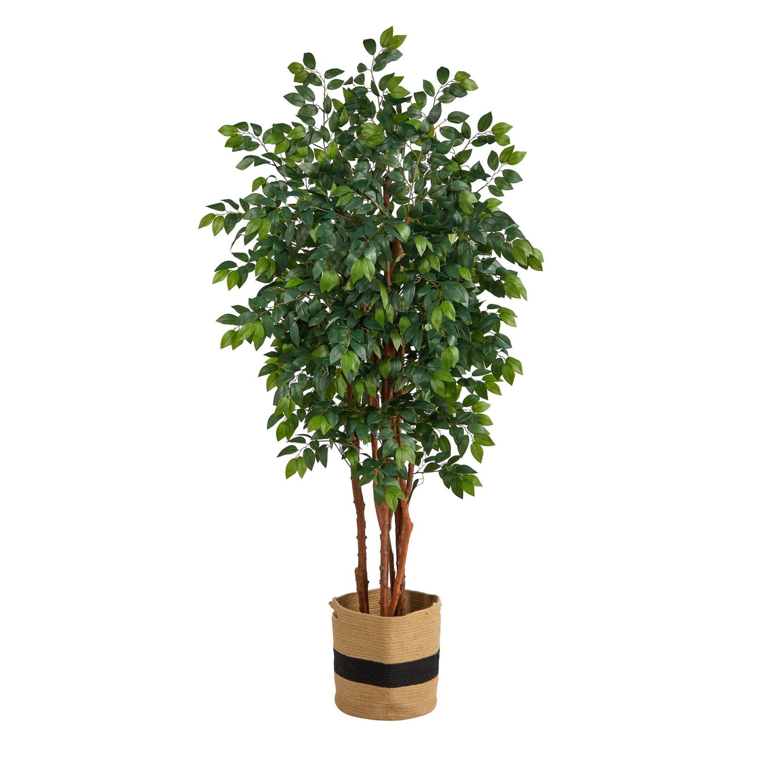 Are you looking for some Zen in your space? Bring an oriental touch with this Sakaki Artificial Tree - native to the tropical regions of Japan, Myanmar, and Nepal. Elegantly showcase green, variegated leaves from 1862 slender bendable branches that arch from 3 braided, slim natural trunks. Standing at 7’, from a natural planter (included in height), this appealing tree gives spaces such as kitchen nooks, living rooms and offices a refresh. Start relaxing today.