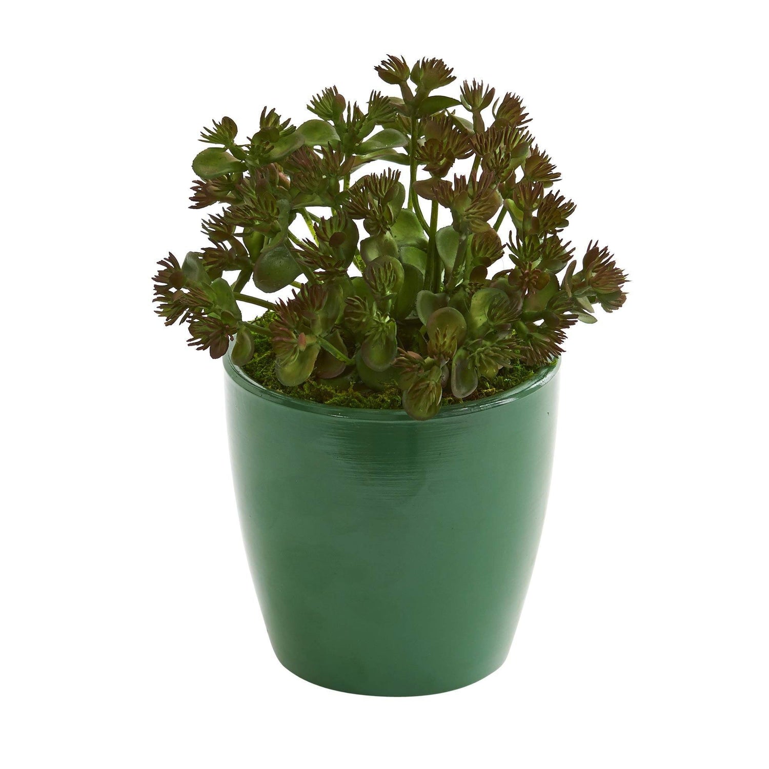 The 7-inch artificial sedum plant’s dark green foliage that comes in a green planter will inject a sense of calm and relaxation into any space’s color scheme. For darker rooms, it’ll blend in quite easily. For a lighter room, it’ll add depth and accent any furniture pieces. With a set of two included, you can place them together on a mantelpiece with other artificial potted succulents for a southwestern inspired look.