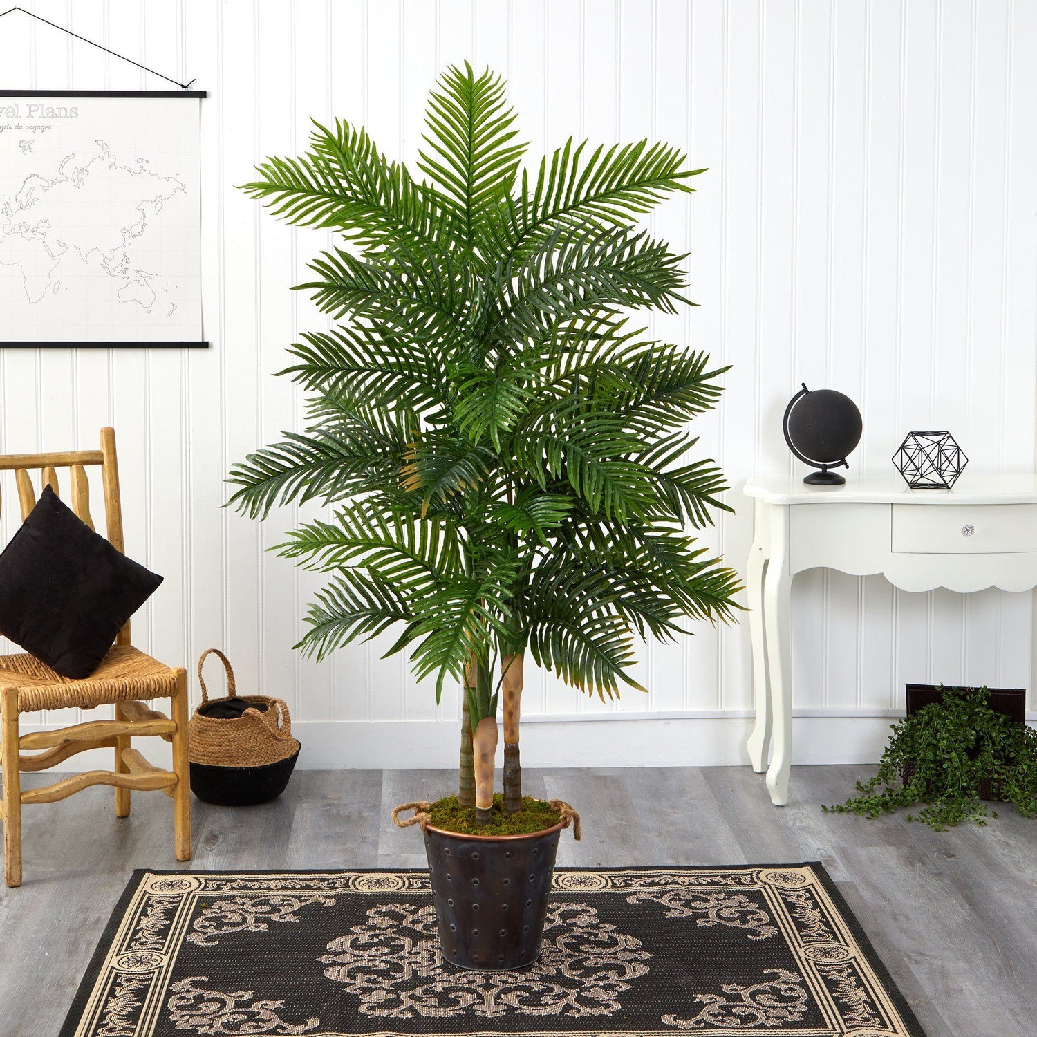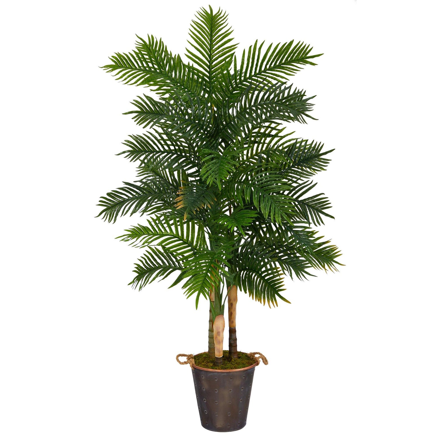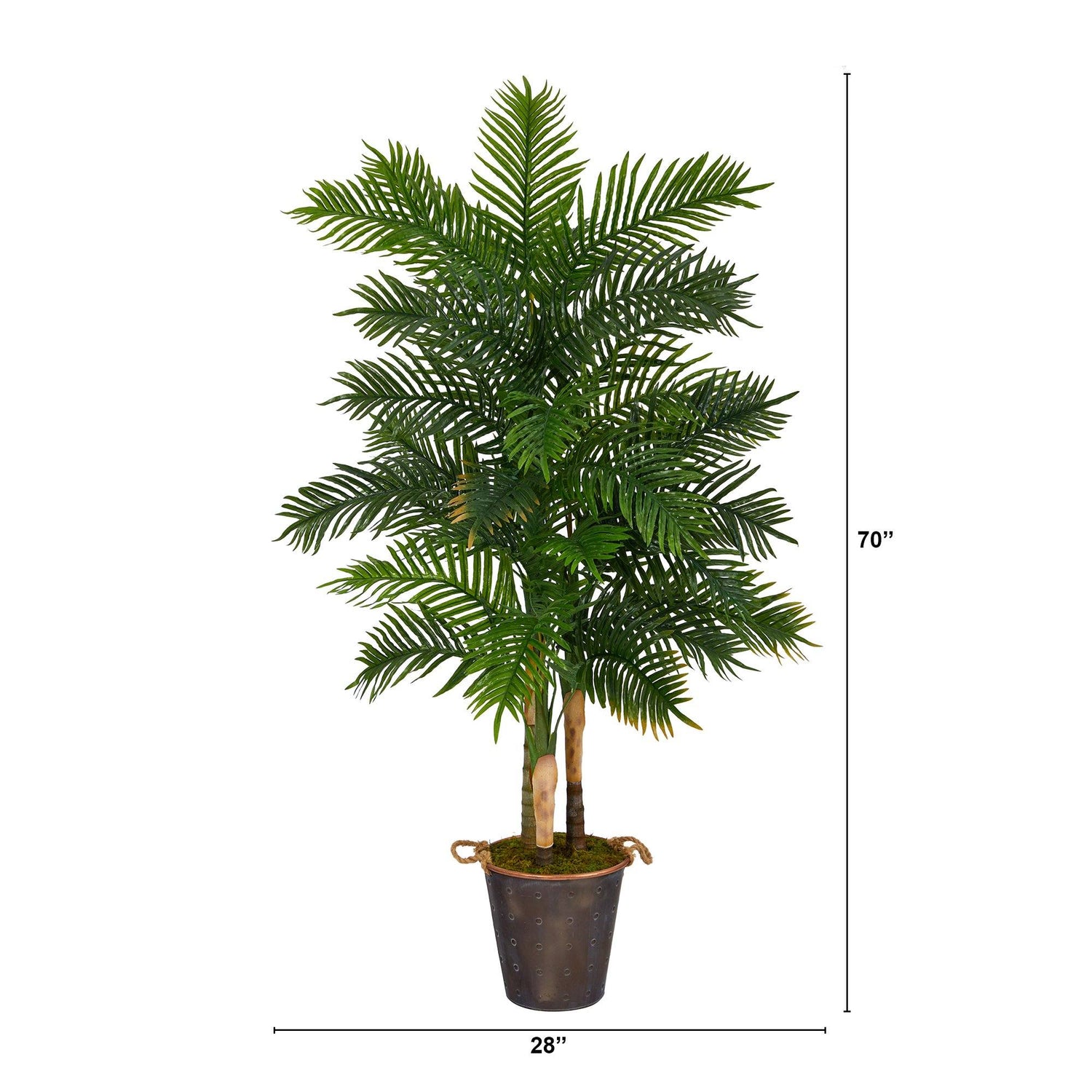 Make and shake a splash with this green fountain full of leaves, greeting your home like its summer all year. Designed to recreate your favorite seaside shore adventures, glee with feather-like, thick variegated, arching palm leaves that stem from 3 matured mixed colored trunks. Standing 70" from a rustic metal pail with rope and faux-grass, place in your room corners, office, or bedroom for some freshness. Perfect for all décor styles that need some more green.