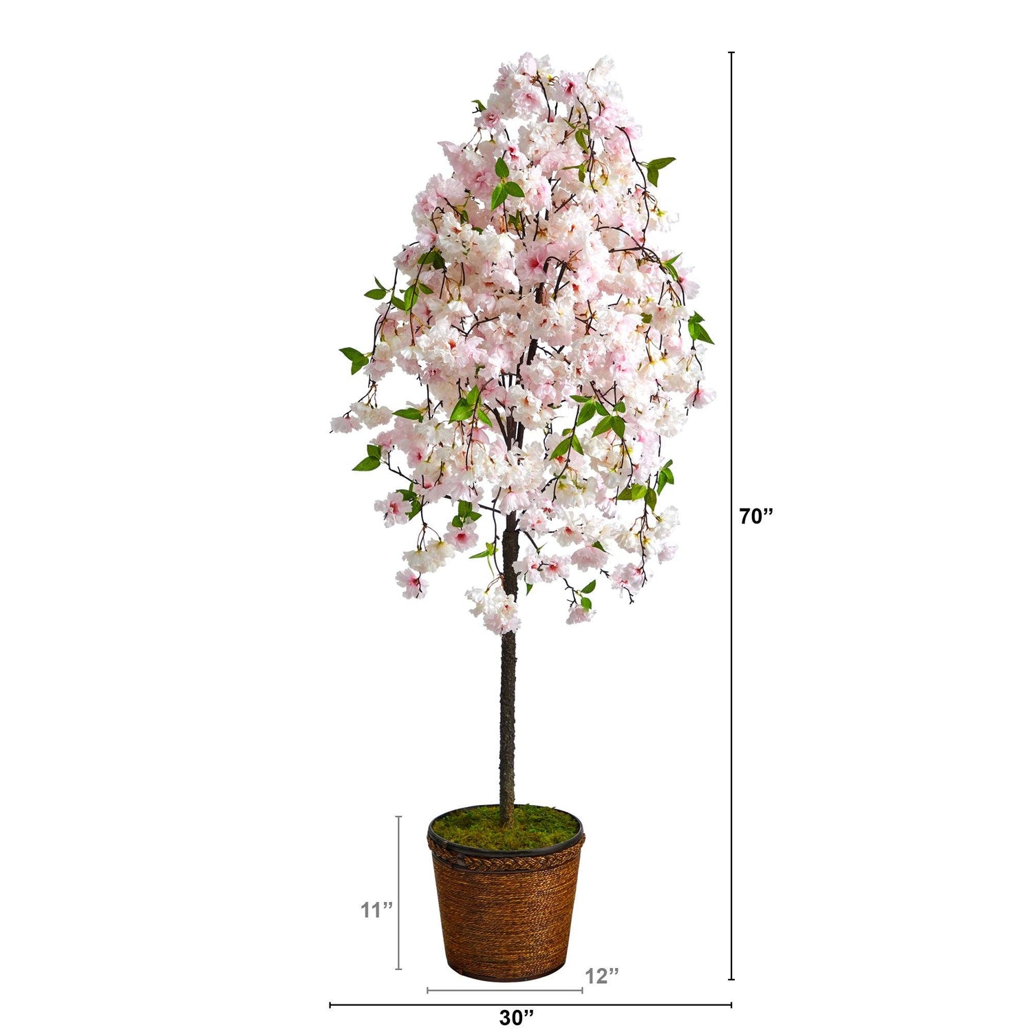 Step into the majestic spring awakening with this Cherry Blossom Artificial Tree. Feel as though you're walking through a Japanese park admiring the pink flowers and drape like twigs adorned by green leaves – stemming from a thin, brown trunk with naturally occurring details. Standing 70" from a wicker planter (included in height), decorate in areas that need some color. Curate in living rooms, bedrooms, offices, or closets.