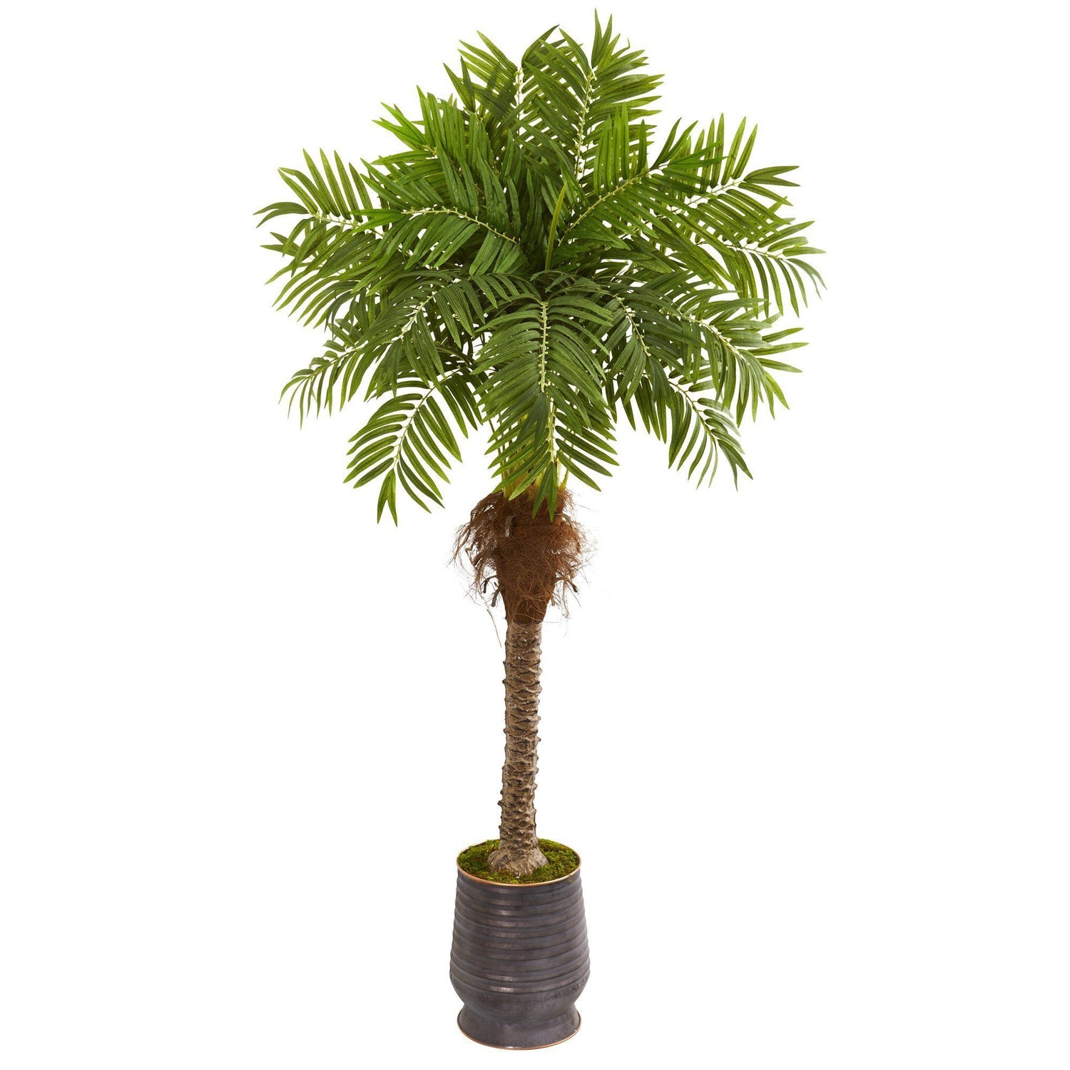 Create your own tropical oasis with this artificial robellini palm tree. Lush and forever green year-round, it boasts thin little leaves spawning from a solid, textured trunk. Standing 73” tall from a metal planter with copper trimming nestled with natural moss, it’s a beautiful way to inject lush greenery into a boho-inspired home.