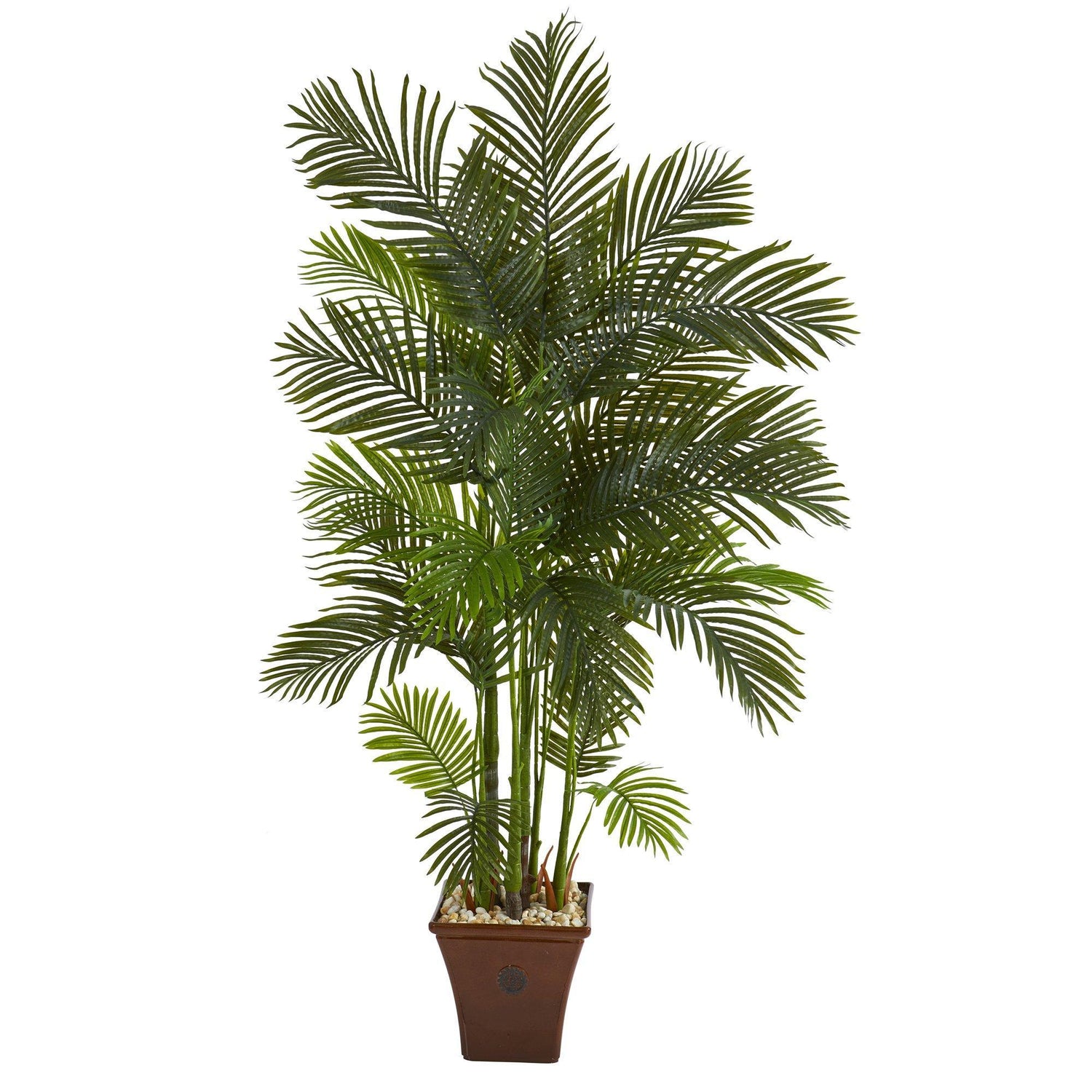 Effortlessly transform a bare space in your home or office with the help of this artificial tree boasting a rich, lush overgrowth of areca palm foliage in bright, vivid hues, intricately designed from the finest materials to evoke a lifelike quality. Standing 74” high from a brown planter, this realistic looking fake tree will inject instant freshness wherever displayed.