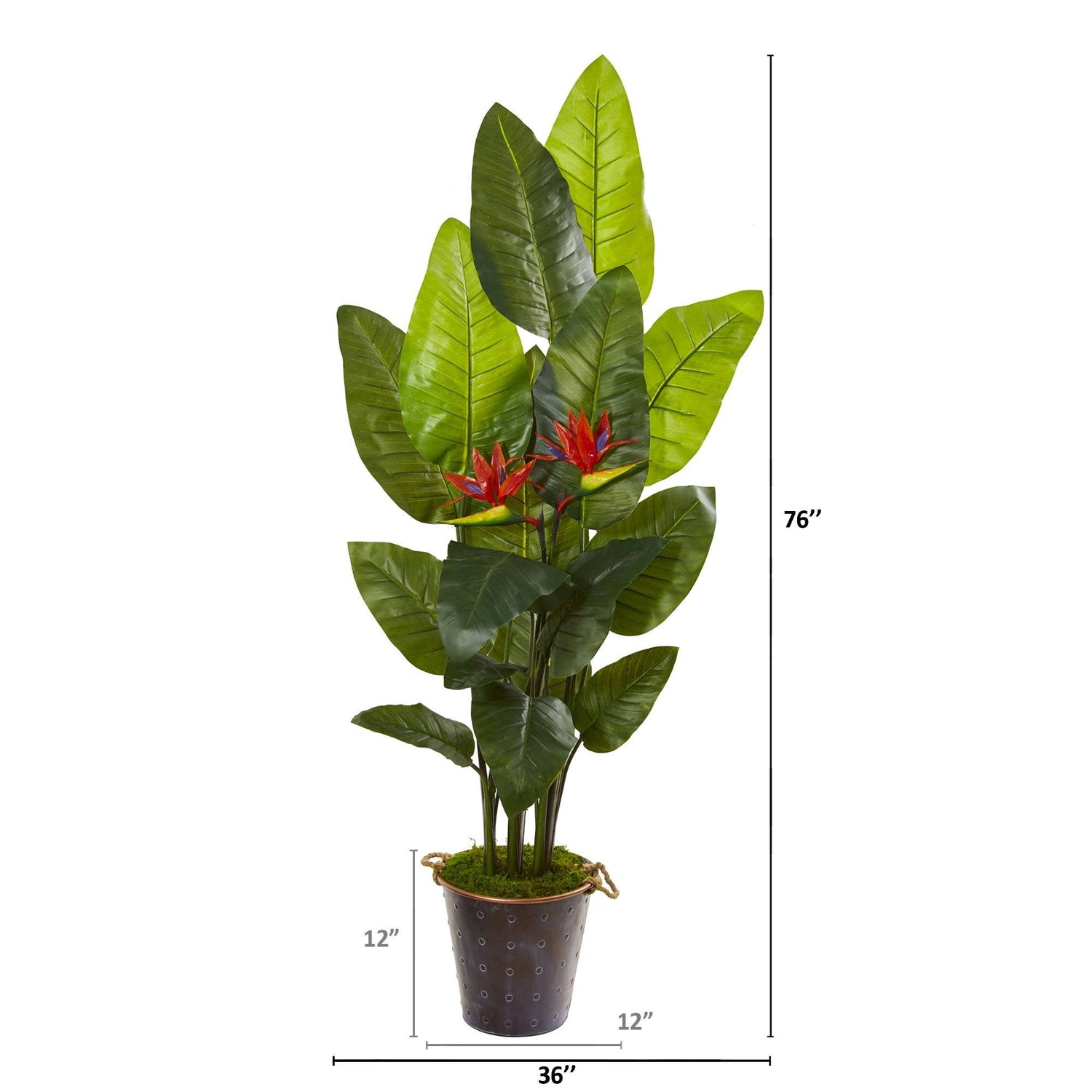 Explosive greenery pours forth from this artificial bird of paradise boasting bright vivid leaves contrasted with realistically designed blossoms - all of which feel real to the touch. Standing 75”’ high from its accompanying planter, this handsome silk plant would instantly freshen up even the tightest spaces.