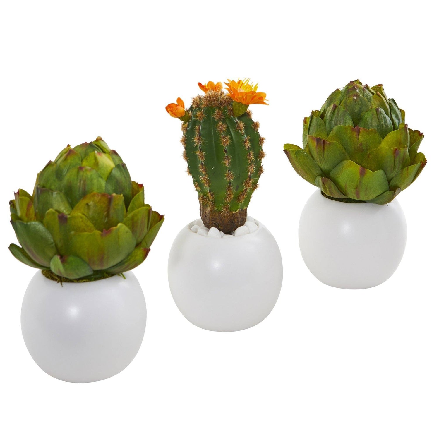 Create your own desert-scape with this set of three artificial artichoke and cactus plants. Each bears realistic qualities and are housed in individual white planter. Standing 8” tall, they’re great for sprucing up a work desk or empty bookshelves.