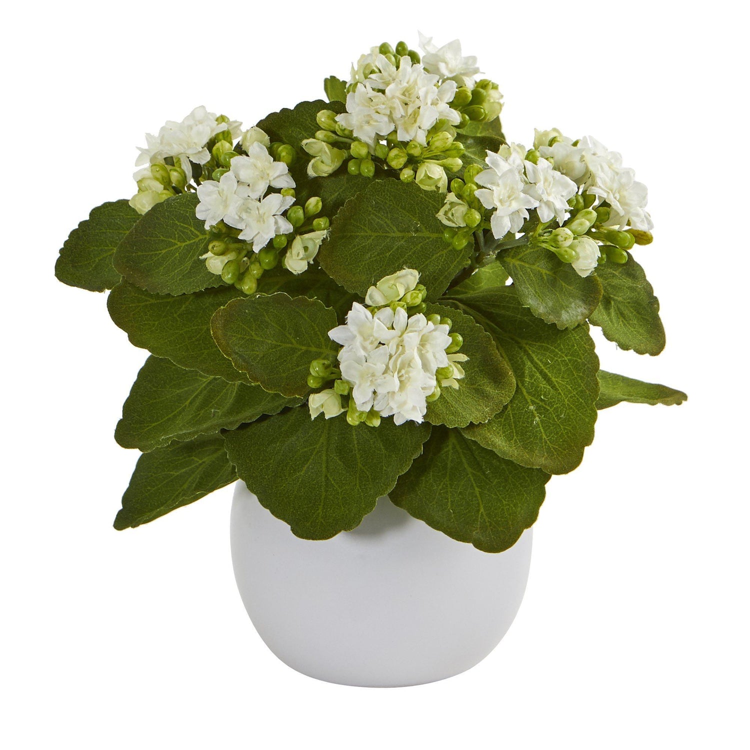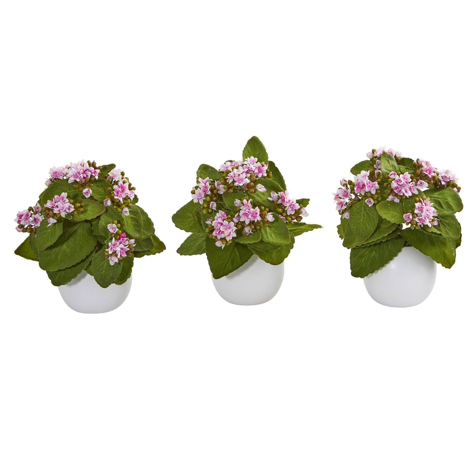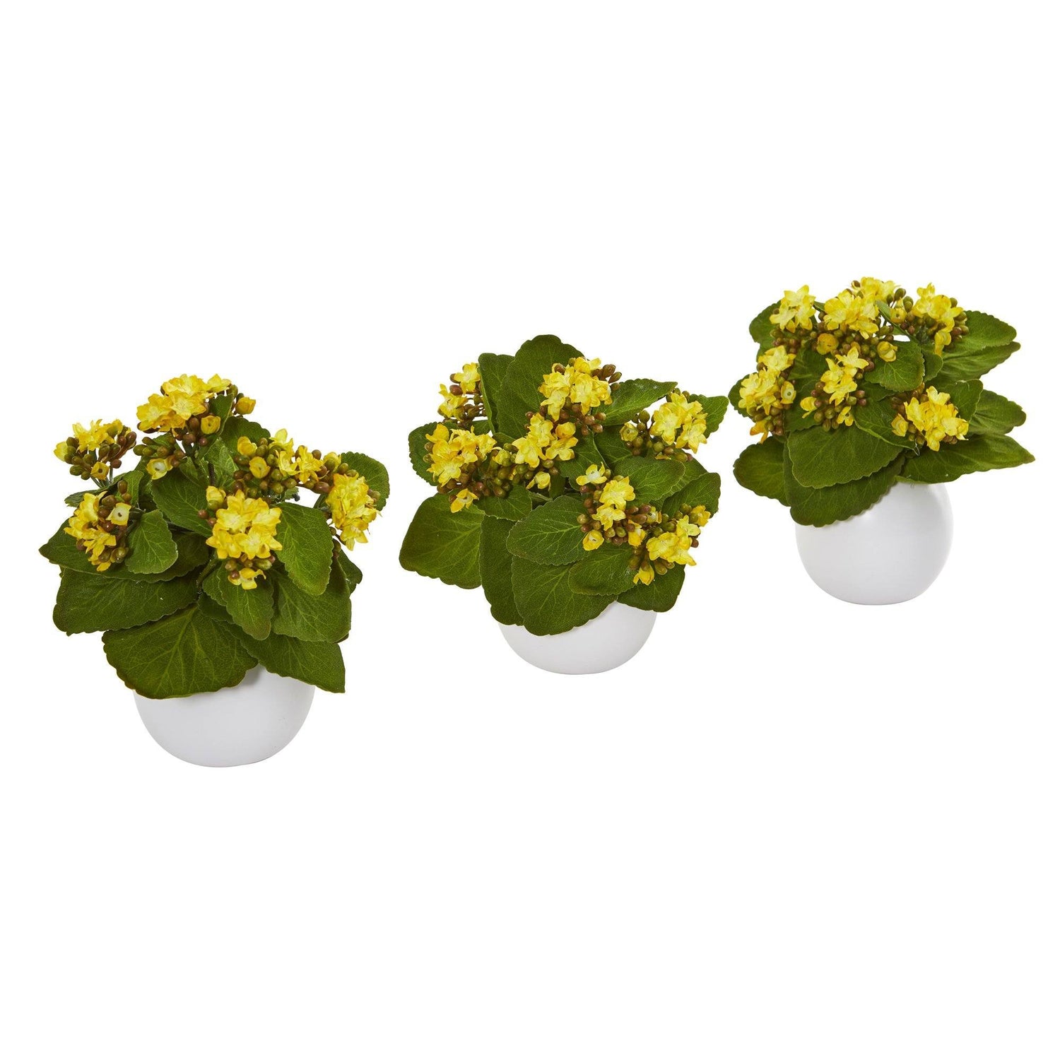 Add splashes of color to home interiors with this set of three artificial kalanchoe plants; each firmly planted in a white vase, these bold blossoms are nestled amongst dark, lifelike leaves. Reaching 8” high, they’re great for arranging along a bookshelf or window will.