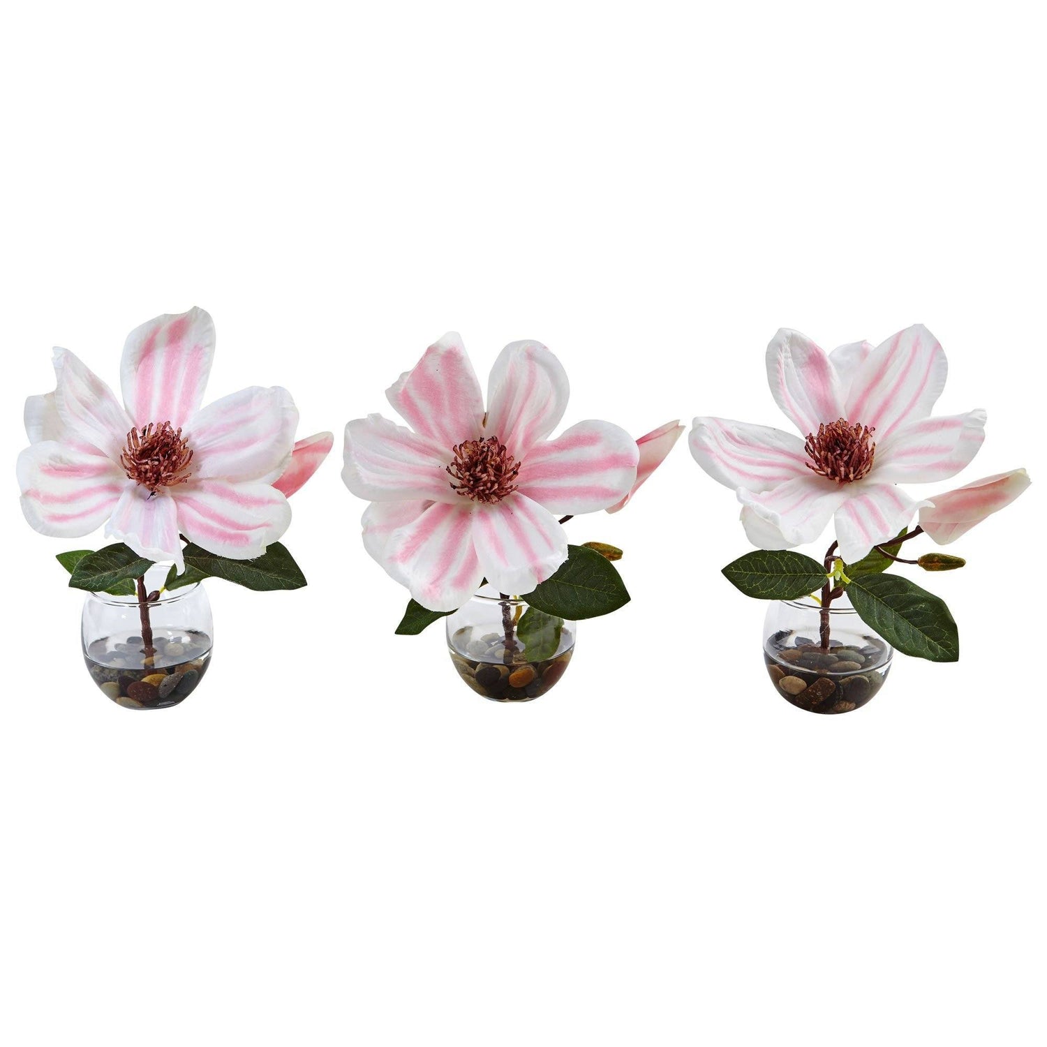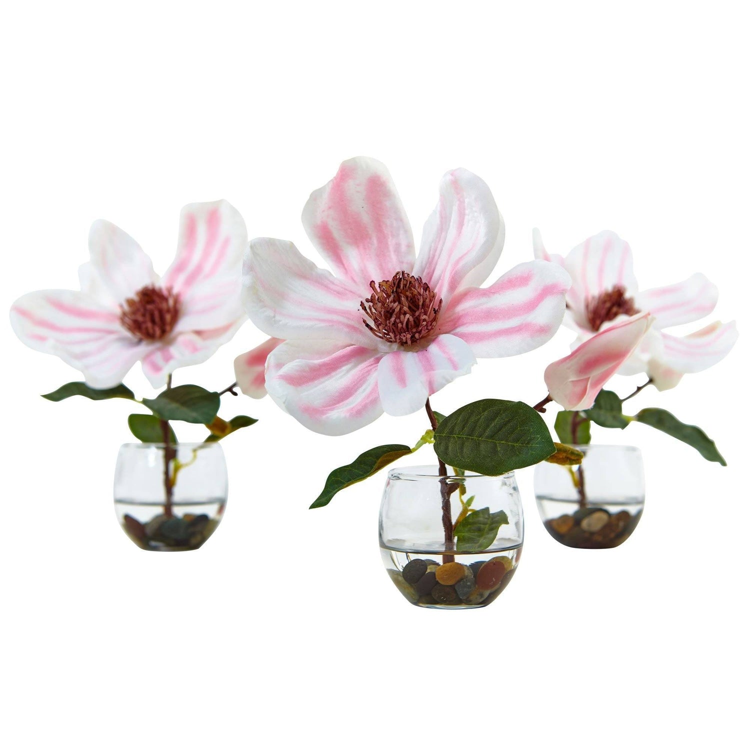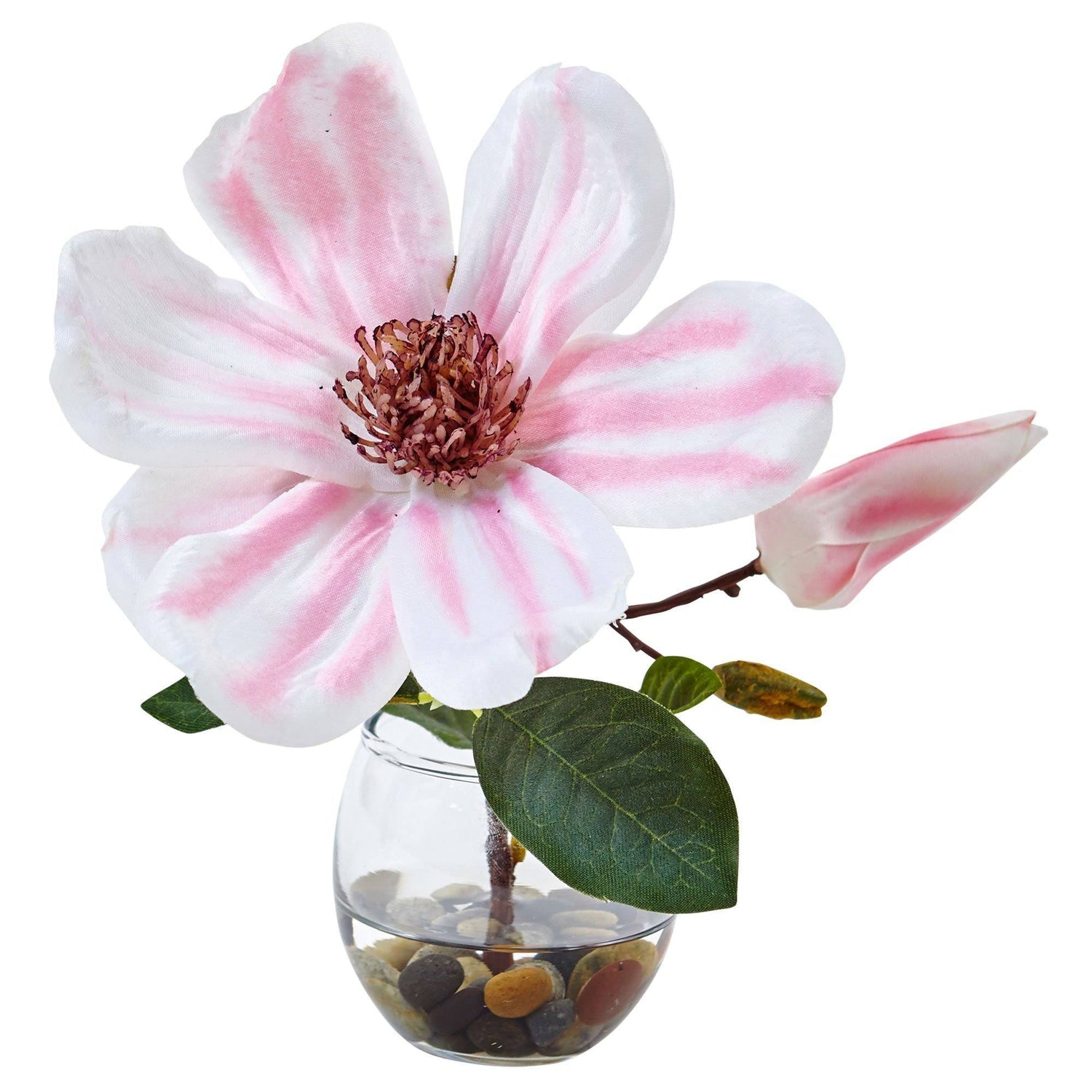 Lightly hued magnolia flowers burst open above a small votive filled with stones and faux water. Stunning attention to detail and fine craftsmanship make these look just like the real thing. With their white and light pink hues, these faux magnolias are easy to mix and match with other items to create a decorative arrangement or table centerpiece.