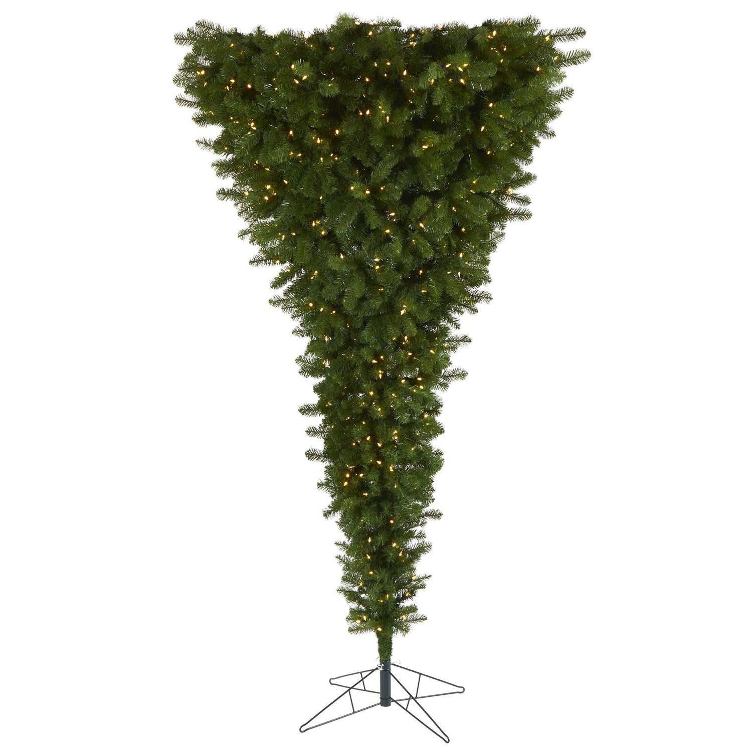 Turn traditional holiday decor upside and opt for this non-so-traditional artificial upside down Christmas tree! Easy to set up and fun to decorate, this quirky Christmas tree boasts a traditional silhouette made up of 1747 easy-to-bend branches to showcase all your favorite holiday ornaments in a very unique way. Arriving pre-strung with 850 warm white (multifunction) LED lights to eliminate unsightly tangles and carefully stabilized on a metal stand, this creative 8’ upside down artificial Christmas tree will undoubtedly be a popular focal point all throughout the holidays.