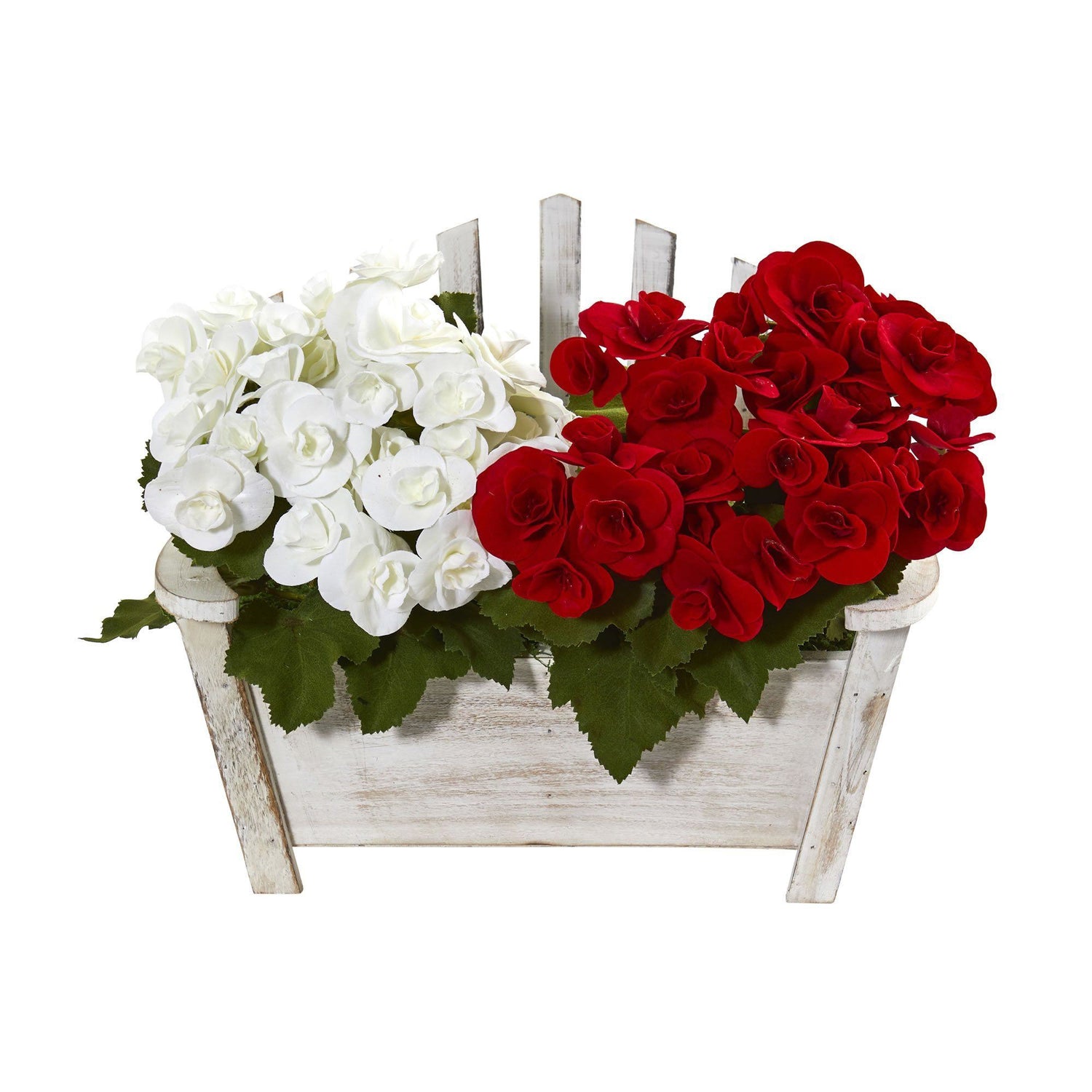 Lush, brilliant blooms with realistic foliage underneath them fill up a white chair design planter with this artificial begonia arrangement. This ornament's vibrant and elegant appearance will make a natural-looking statement in your reading nook or sunroom. Settle it on your bookshelf or console table next to porcelain figurines, books or magazines for a natural finish.
