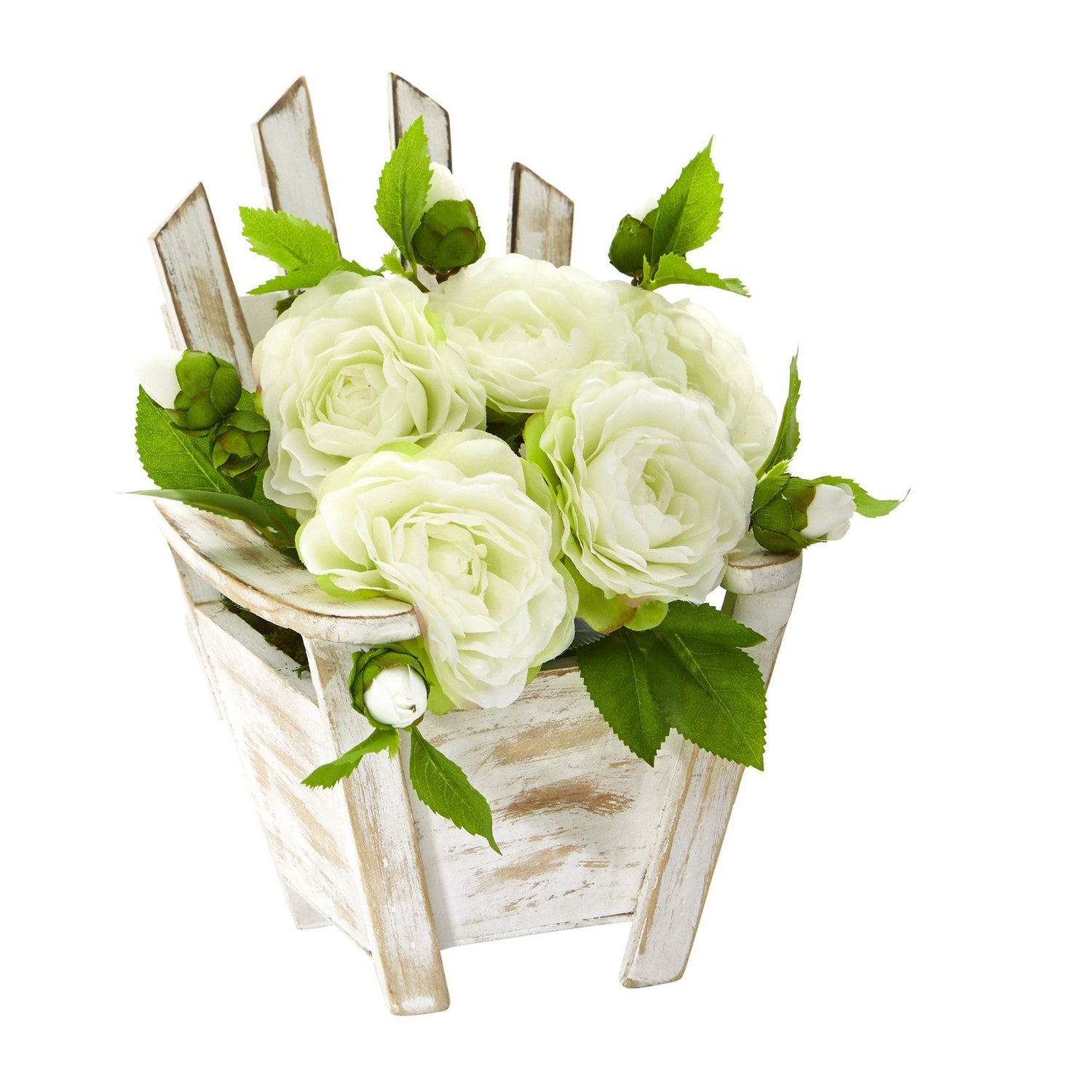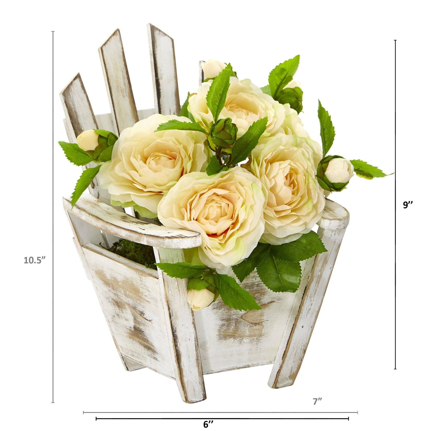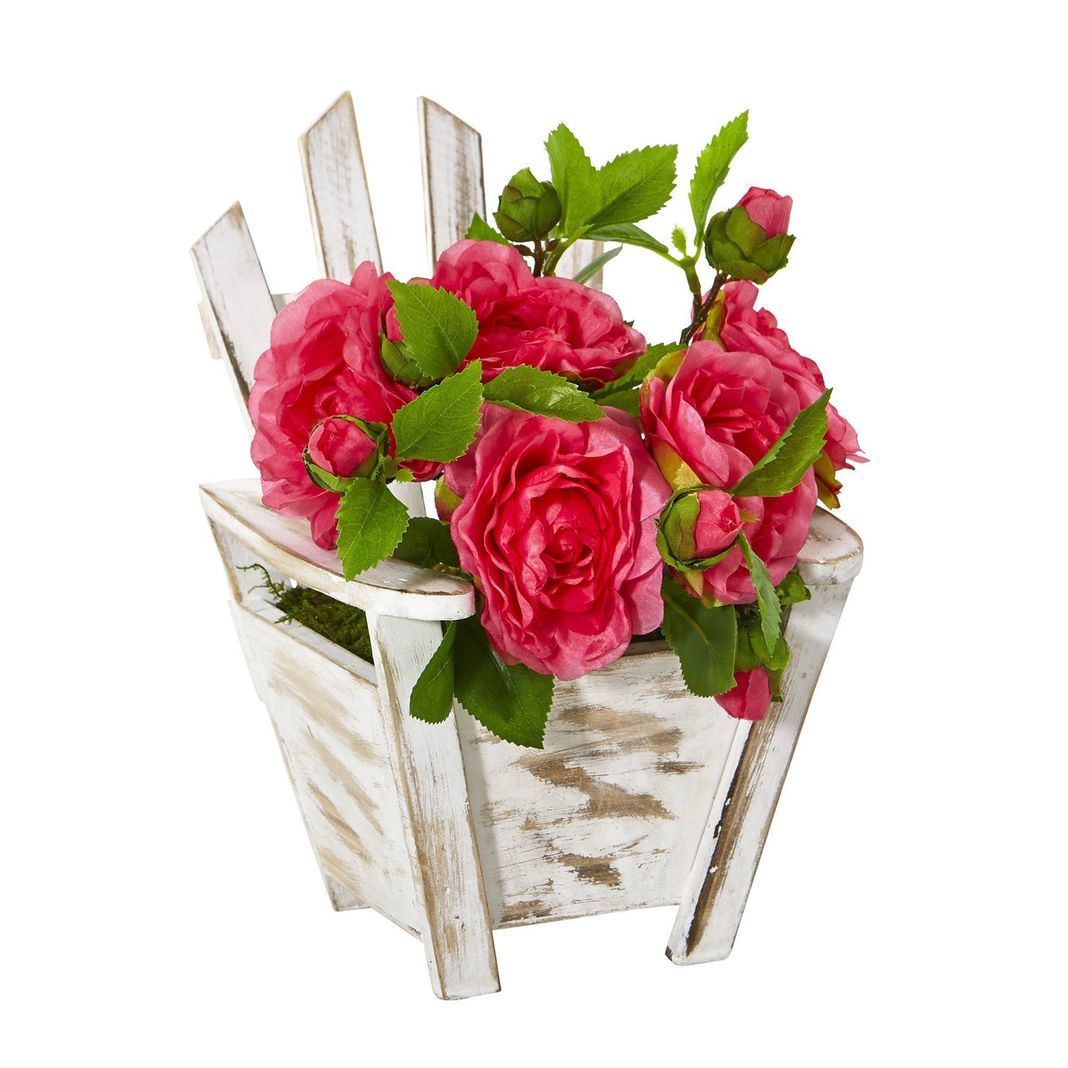 Accent your space with this artificial arrangement of camellias, boasting lush silk blossoms carefully nestled with bright, lifelike foliage. Reaching 9” tall from a chair planter, it would beautifully complement country-inspired decor.