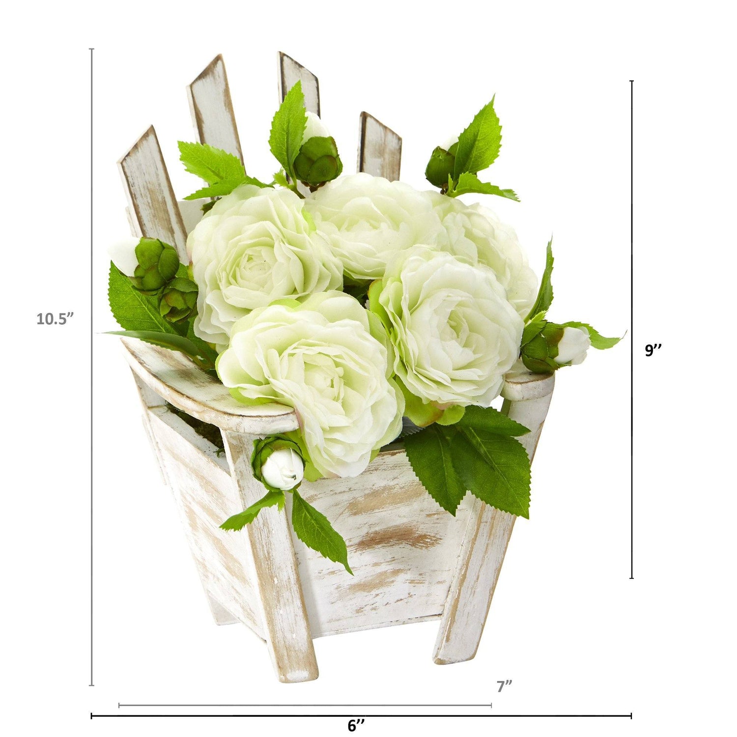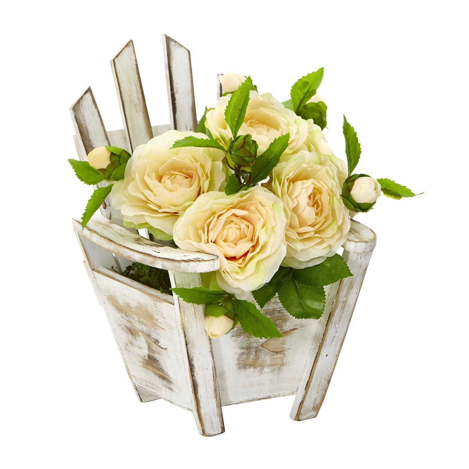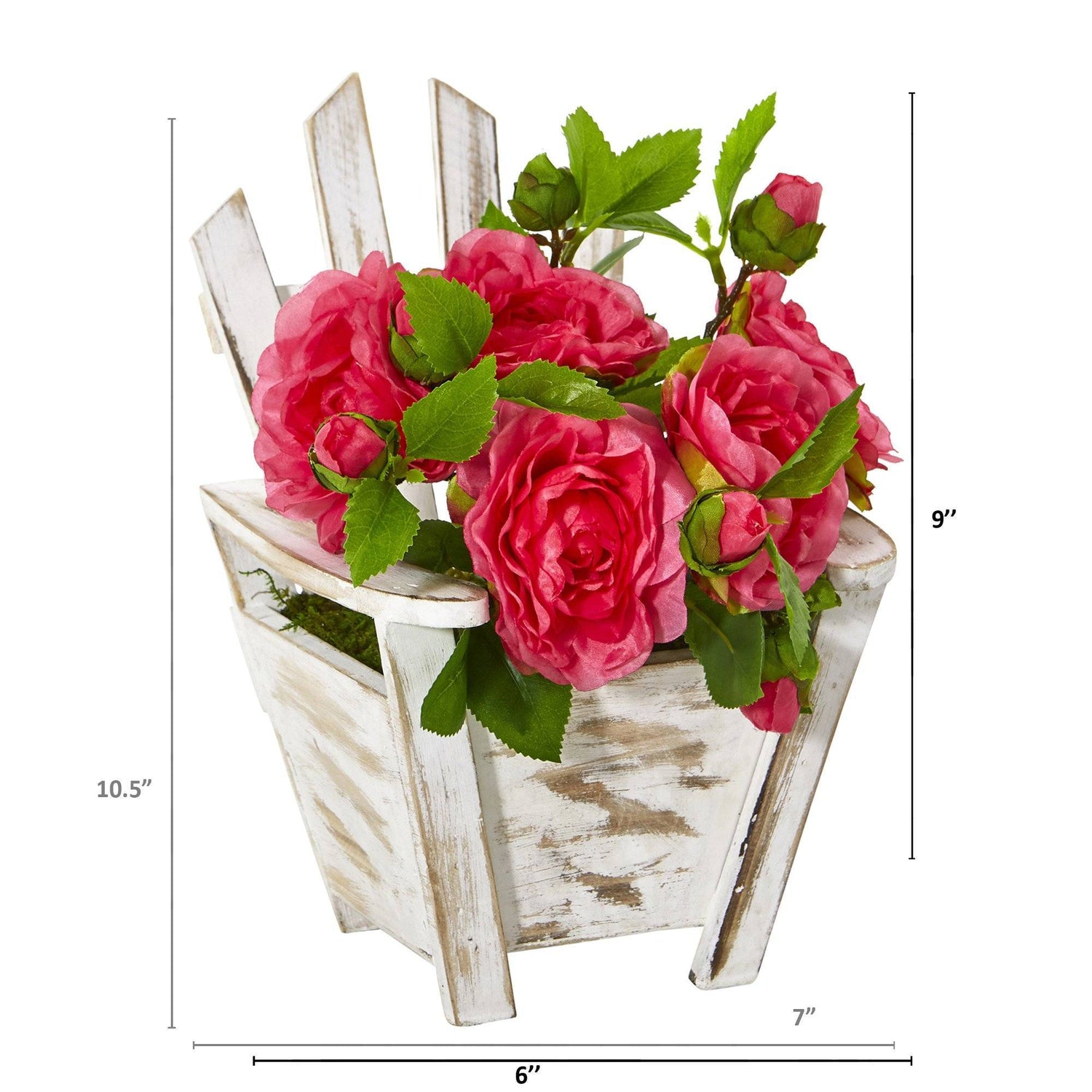 Accent your space with this artificial arrangement of camellias, boasting lush silk blossoms carefully nestled with bright, lifelike foliage. Reaching 9” tall from a chair planter, it would beautifully complement country-inspired decor.