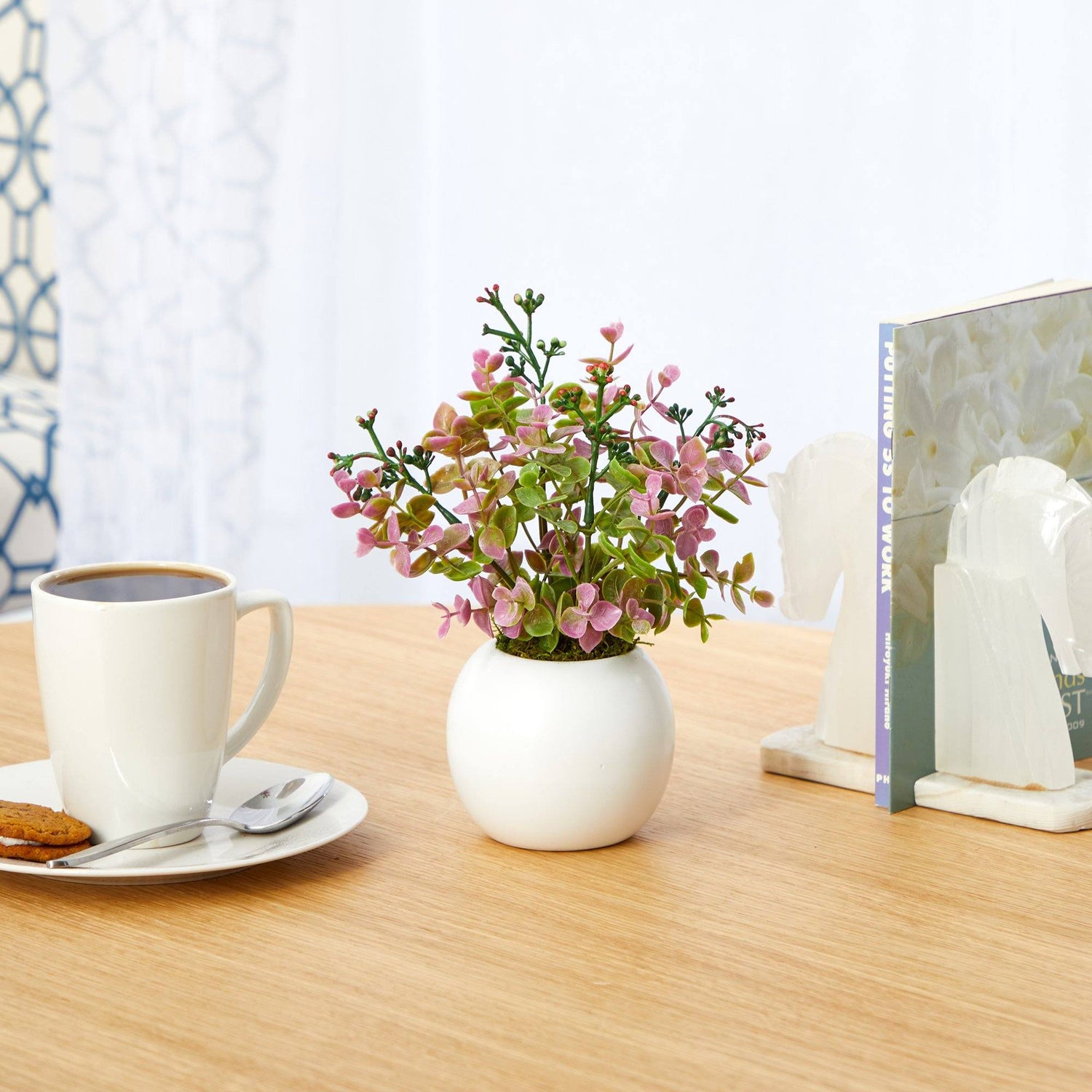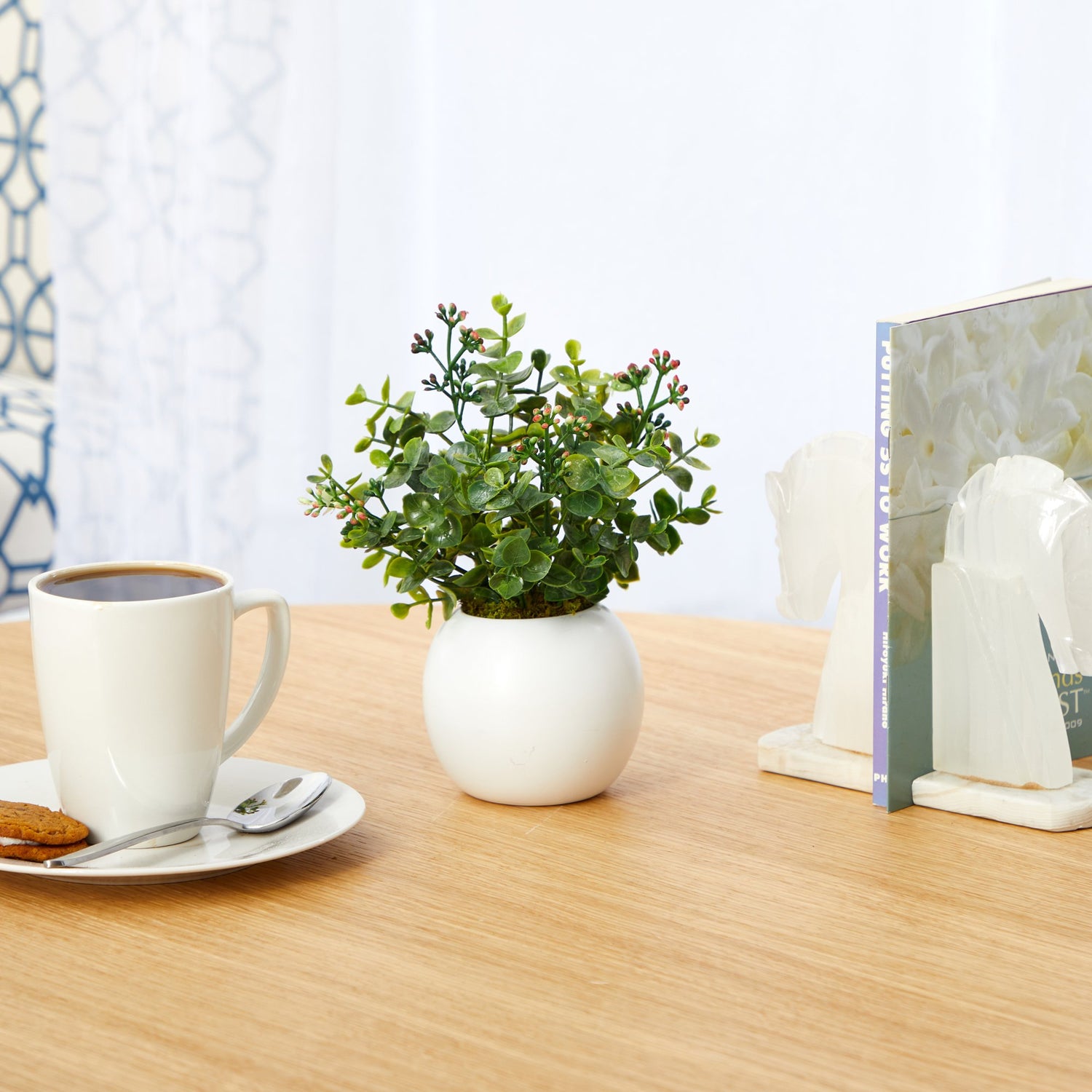 Add hints of natural textures throughout small intricate spaces with this artificial plant boasting a mix of authentic-looking sedum succulents showcasing naturally occurring qualities, carefully tucked amidst complementary eucalyptus foliage. Standing 9” tall from a white planter stabilized with natural moss, this tiny fake plant would make a handsome accent to a home or office space.