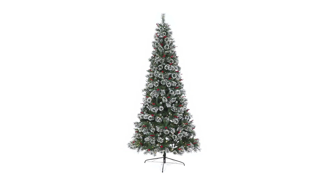Evoke hints of a winter wonderland this holiday season with the help of this frosted artificial Christmas tree! Completely maintenance-free, this winter-inspired fake Christmas tree boasts countless tiers of soft looking pine foliage made up of 1397 easy-to-bend branch tips for showcasing your holiday ornaments, accented throughout with faux holly berries, and lightly frosted with hints of faux snow to evoke the ultimate winter setting. Arriving pre-strung with 700 clear LED lights to eliminate tangles and carefully stabilized on a metal stand, this impressive 9’ tall frosted artificial Christmas tree will not only make holiday decorating a breeze but ensure your home is always holiday-dressed for years to come.