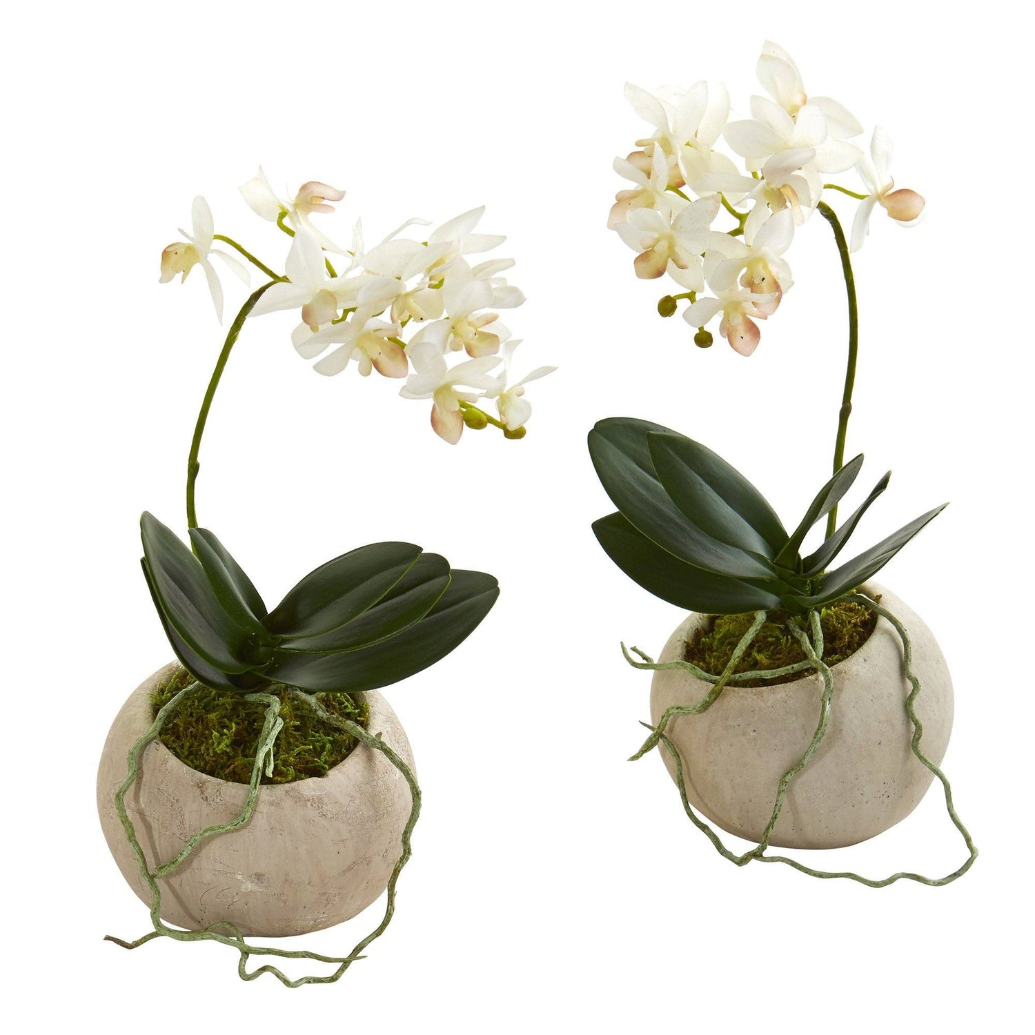 Incorporate little hints of natural elegance throughout your home with this set of artificial arrangements; each showcasing silk phalaenopsis orchids, intricately designed in mid-bloom as they rise from dark, glossy leaves. Designed from the finest materials to convey a lifelike realism, this enchanting pair of arrangements each stand 9” high from their individual stone gray vases.