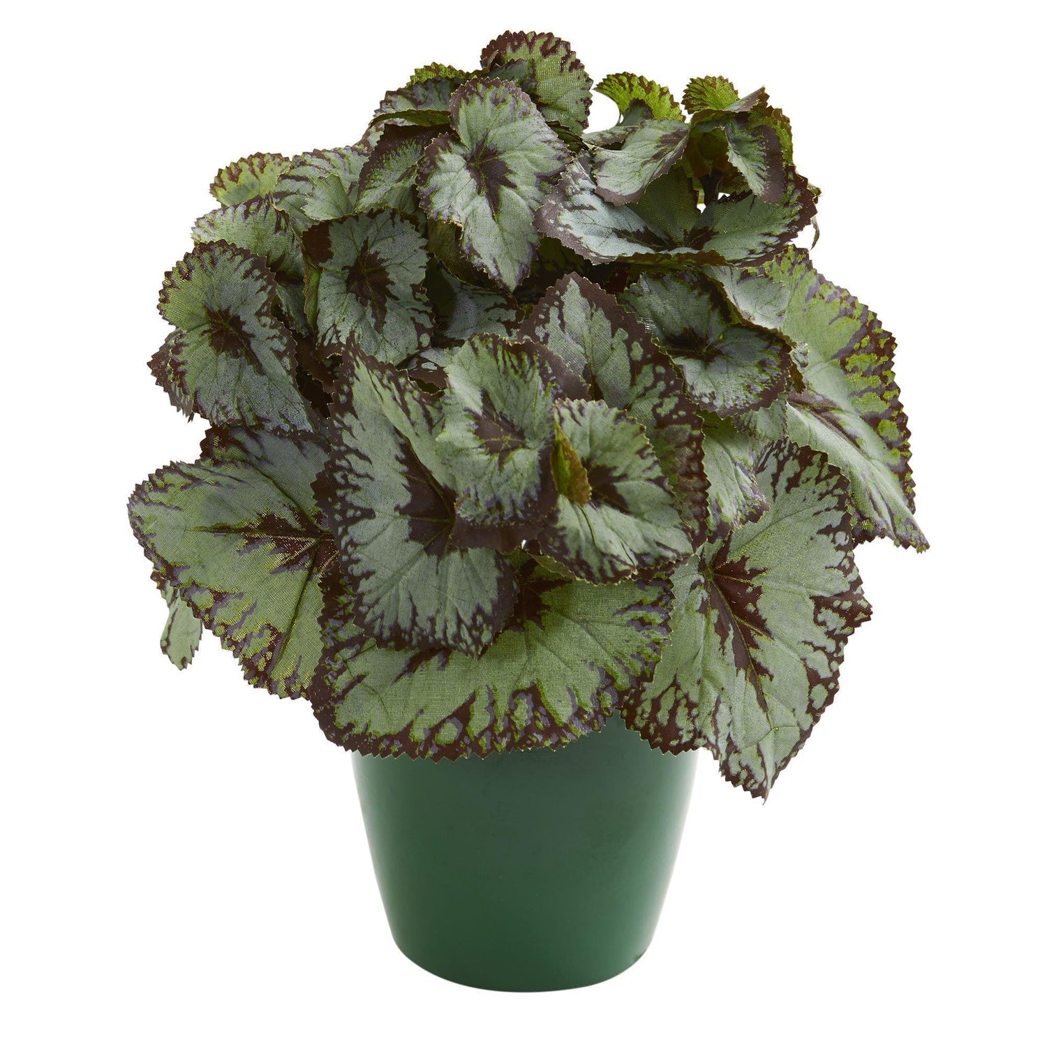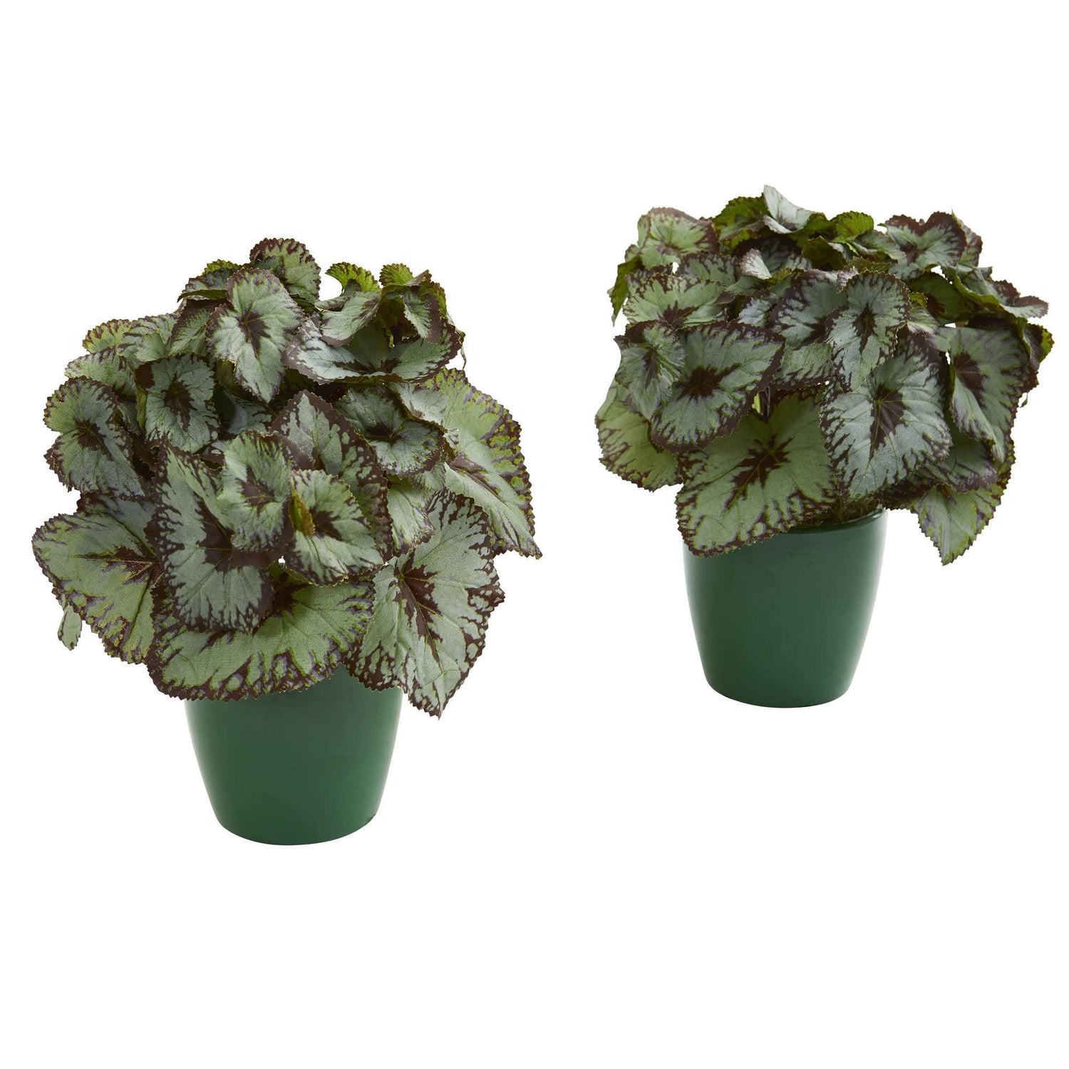 Lush, variegated dark green leaves of the artificial rex begonia plant are bundled together in an included green planter to create a striking appearance. Standing at only 9 inches, this set of two can be easily laid on top of small furniture or tight spaces. Try placing it as a centerpiece of your breakfast nook's table with white ceramic tea cup set for a beautiful contrasting arrangement.