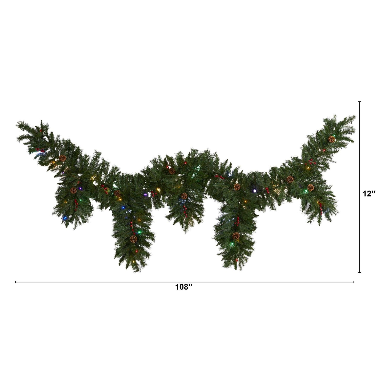 Up the ante on your holiday decor scheme this Christmas with the help of this artificial winter garland; intricately designed from an overgrowth of realistic looking seasonal evergreens, it features various tendrils cascading down in an icicle-like design, carefully accented throughout with faux pinecones and holly berries that look incredibly lifelike. Arriving pre-strung with 50 multi-colored LED lights to add a soft, holiday glow to vertical surfaces, this 12’ long artificial garland will undoubtedly complete an enchanting holiday setting for years to come.