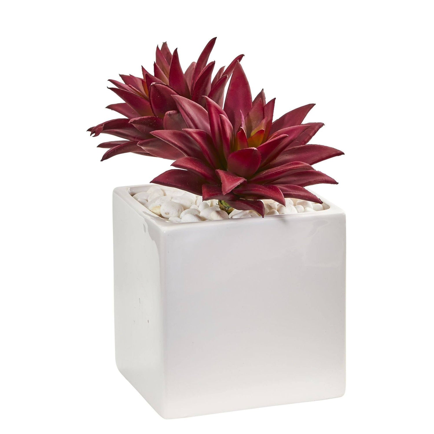 This artificial agave succulent comes in a set of two. Each piece is nestled in their own square vase - the orange-hued succulent is tucked in a white vase while the burgundy one is in a black vase. At only 8 inches, this ornament is a stunning addition to a well-decorated sideboard or end table. Combine them with faux flowers in pastel vases to create a lush, colorful arrangement. Includes faux river rocks.