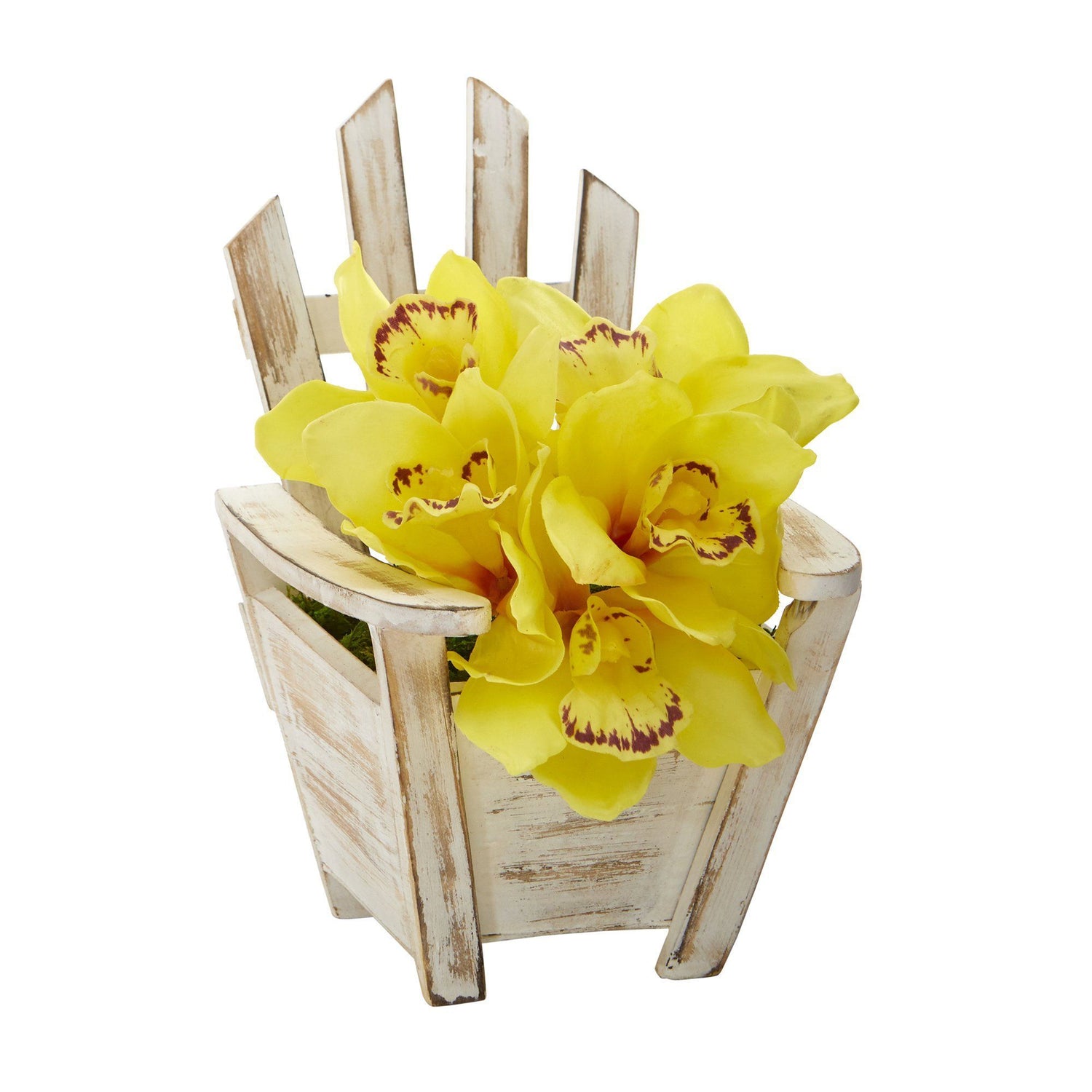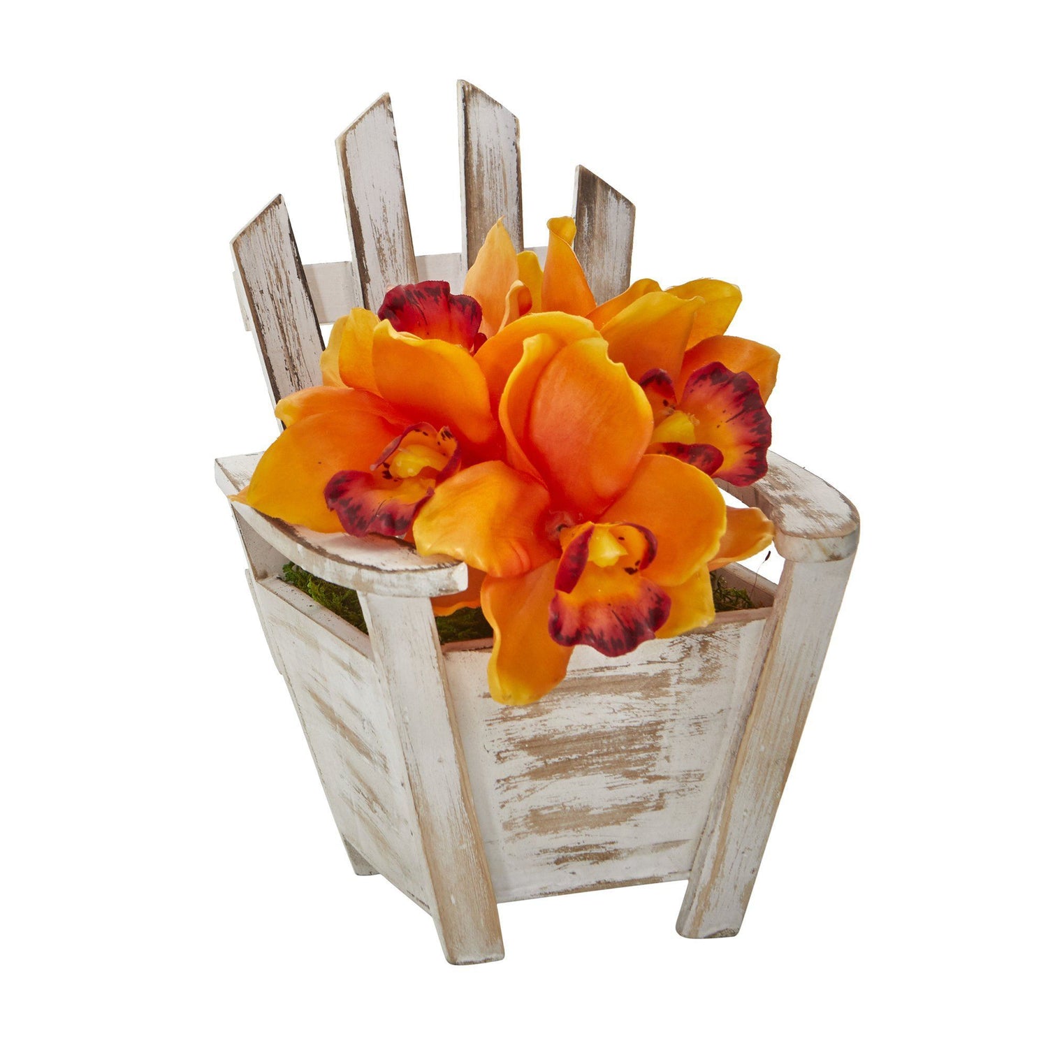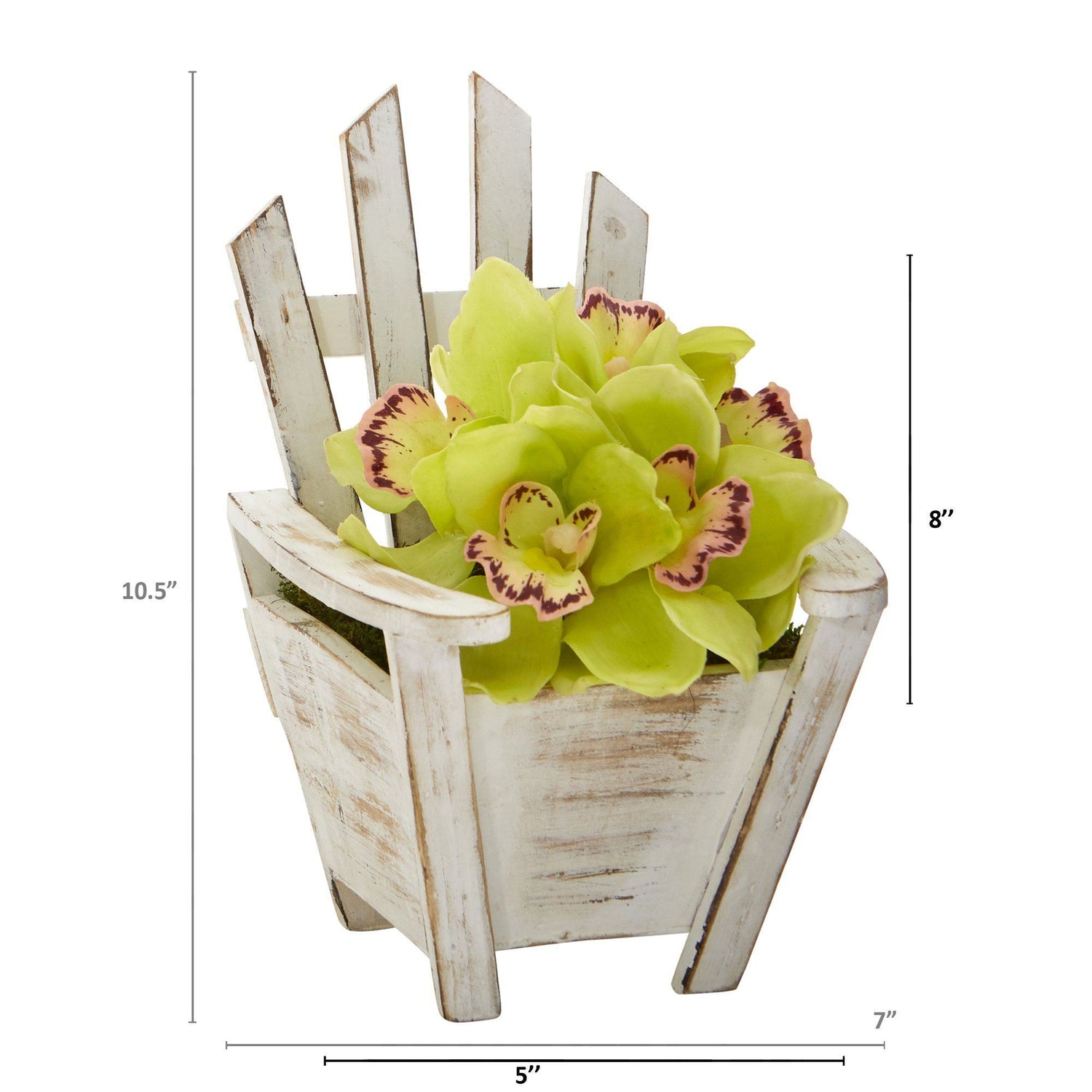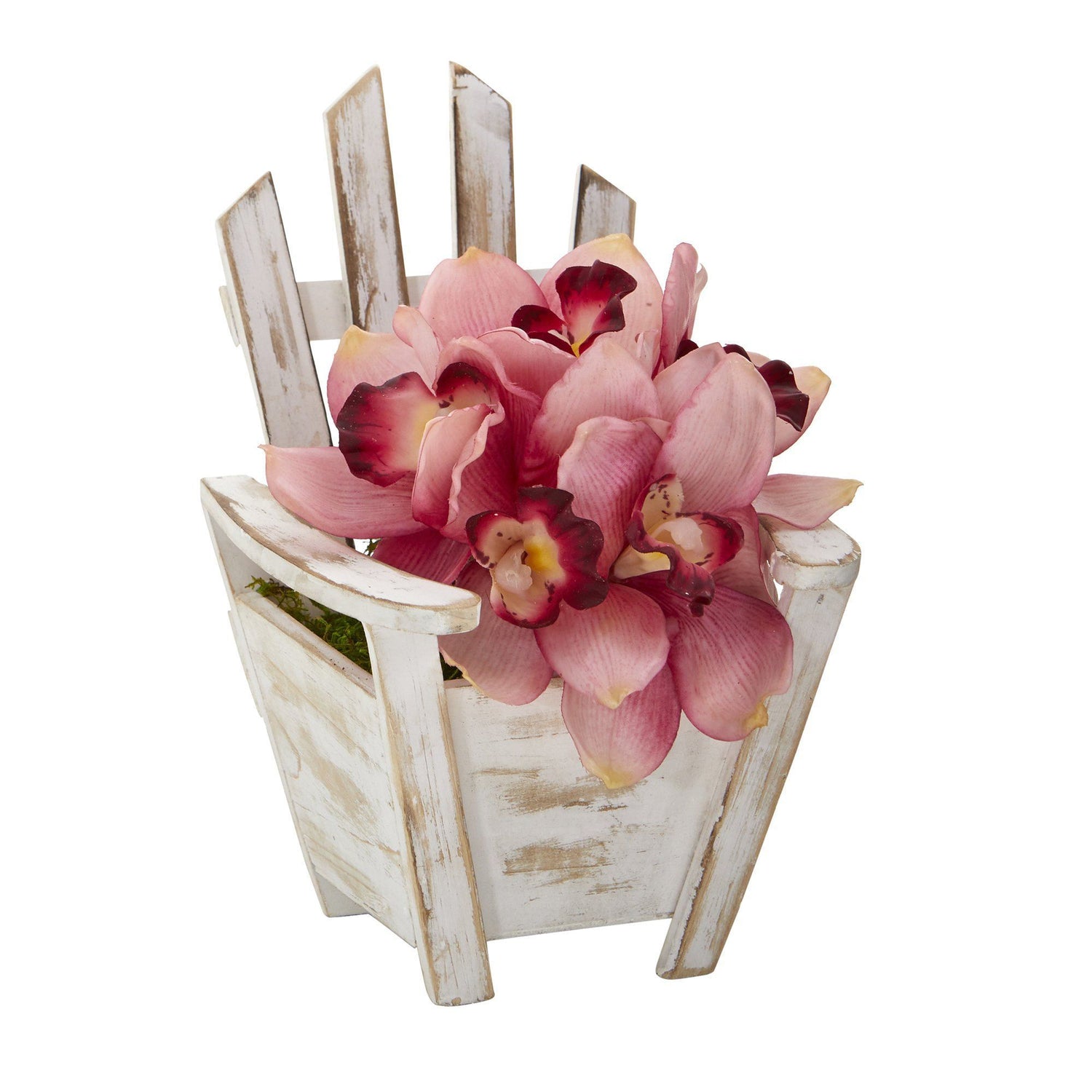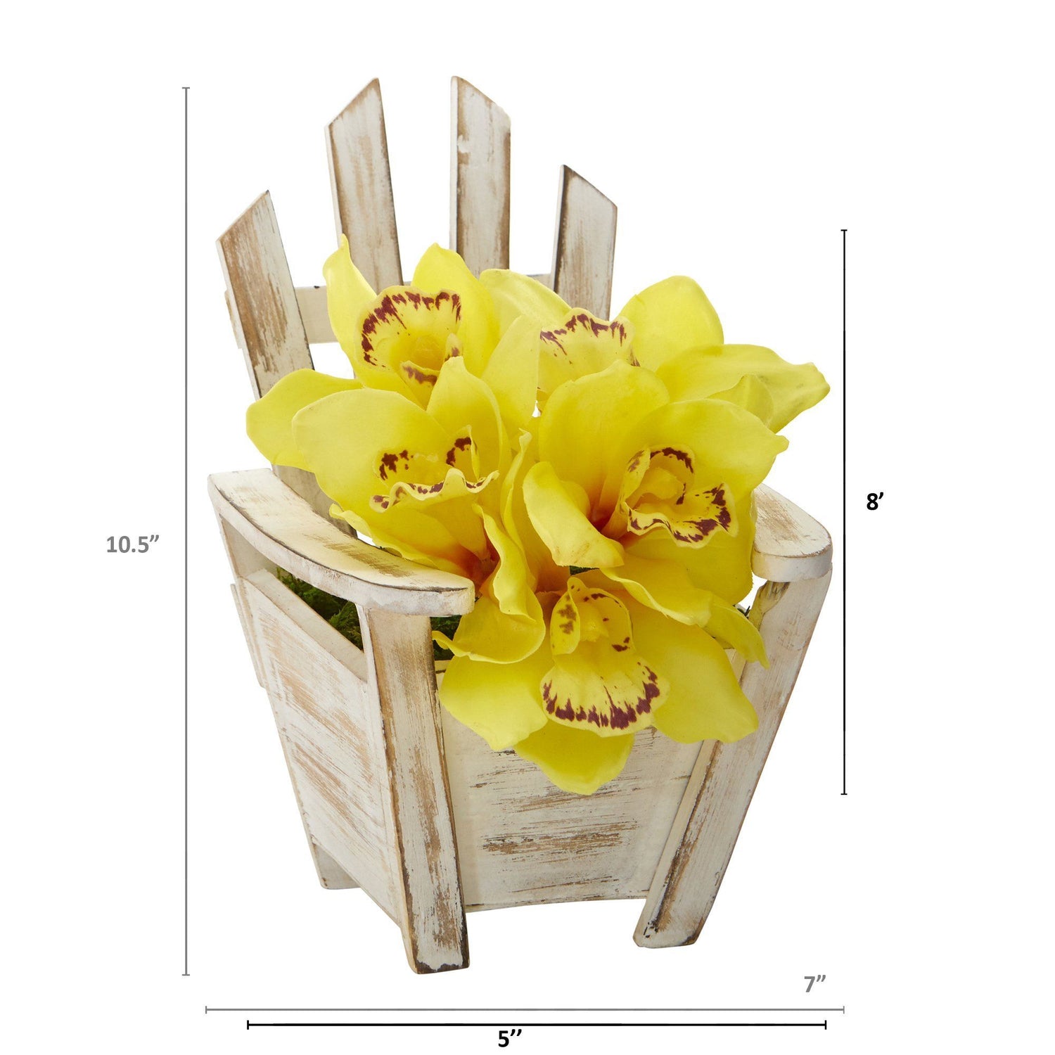 Add a touch of classic beauty to highlight bare spaces with this artificial arrangement of cymbidium orchids, each silk floral showcasing naturally occurring details in soft, subtle hues. Standing 8” tall from a chair planter, it would make for an eye-catching accent wherever displayed.