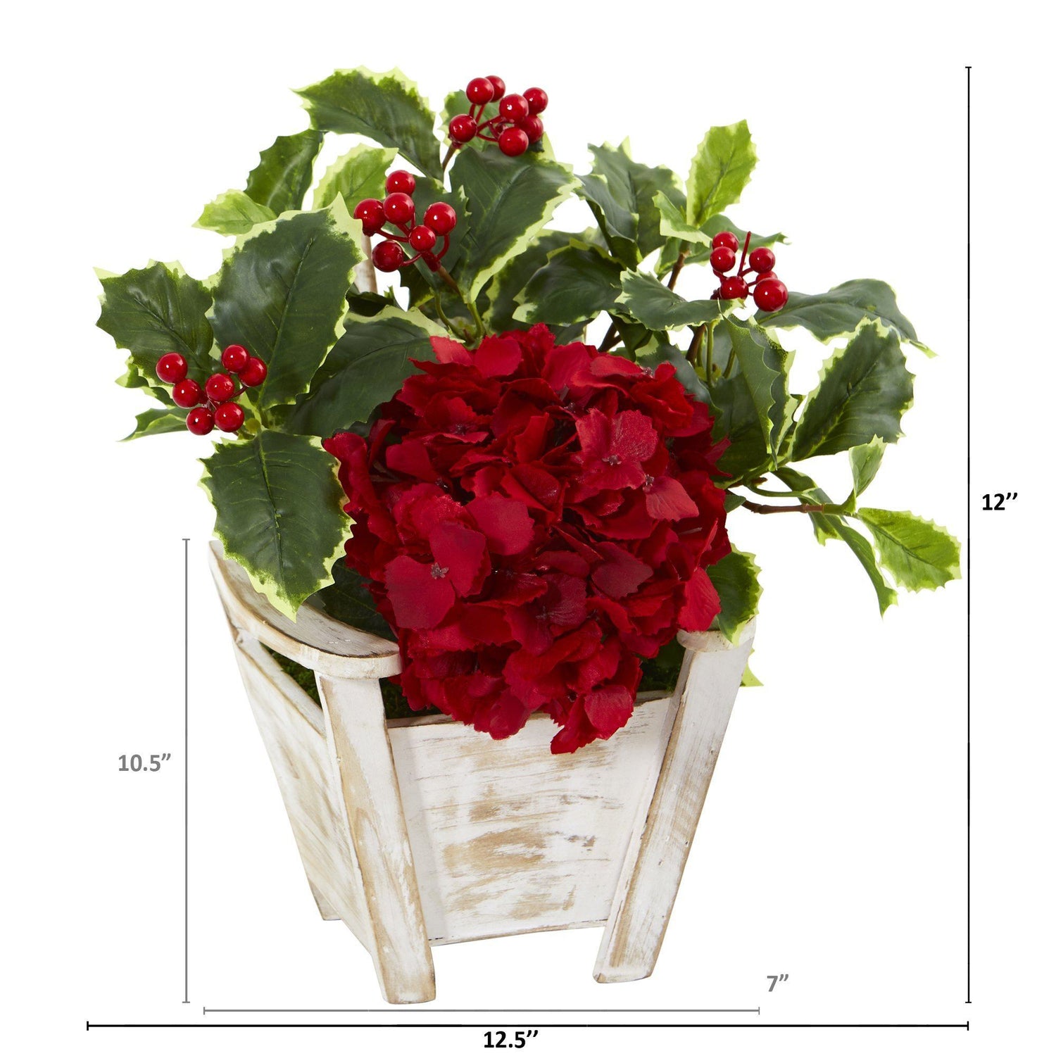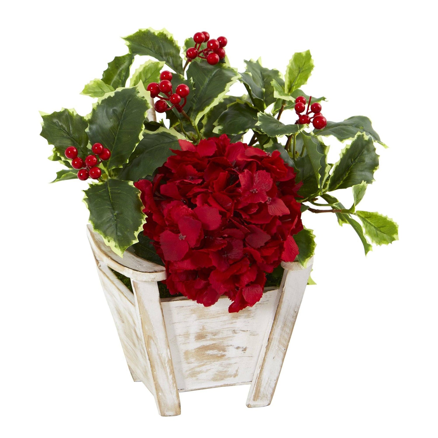 Brighten bare spaces with this artificial arrangement showcasing intricately designed hydrangea blossoms in bright seasonal colors, handsomely contrasted with variegated holly leaf foliage and bright red berries. Standing 12” high from a chair planter, it's a cheerful addition to holiday decor.
