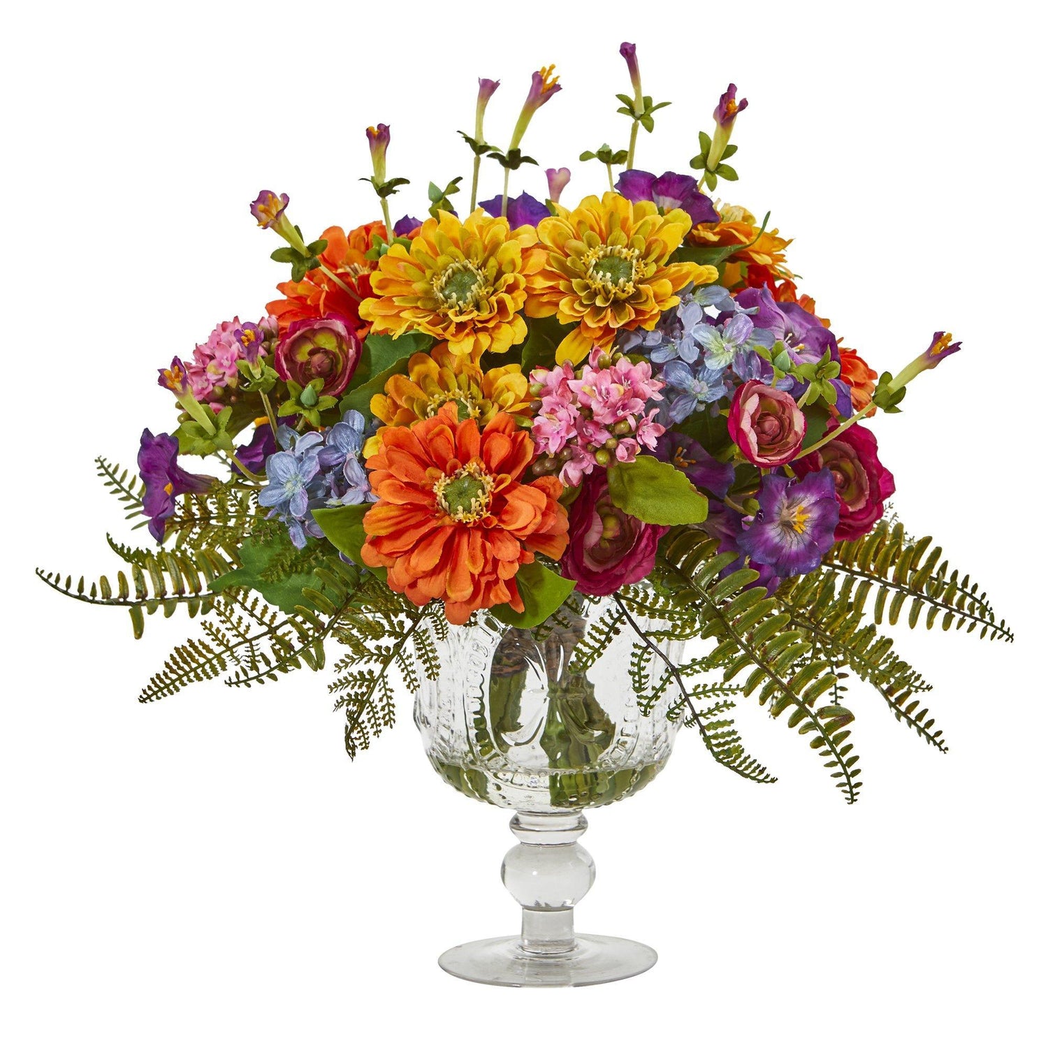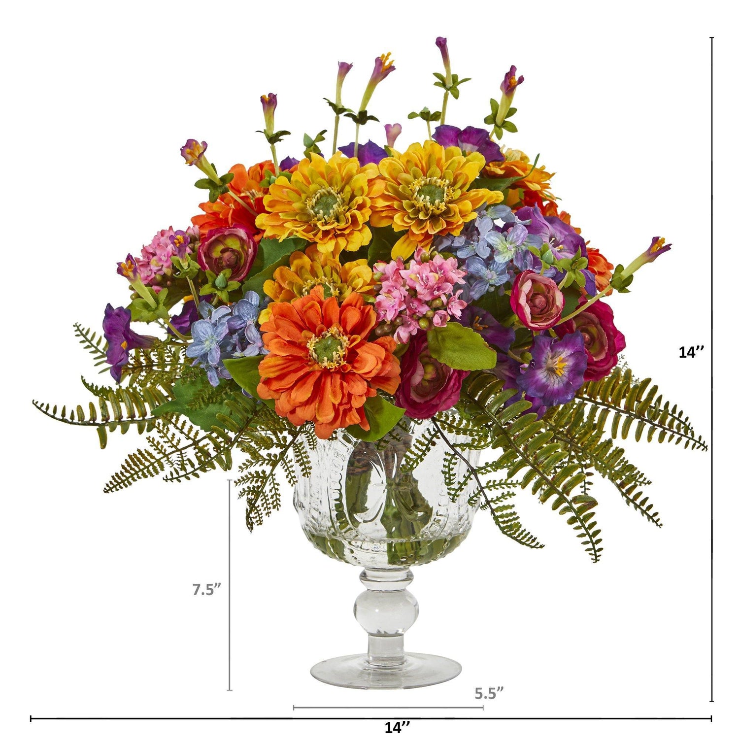 Keep it spring year-round with this artificial arrangement of mixed flowers, boasting a vivid palette of rich color, all complemented with lifelike greenery. Incredibly realistic with naturally occurring details, it stands 14” tall from a royal vase.