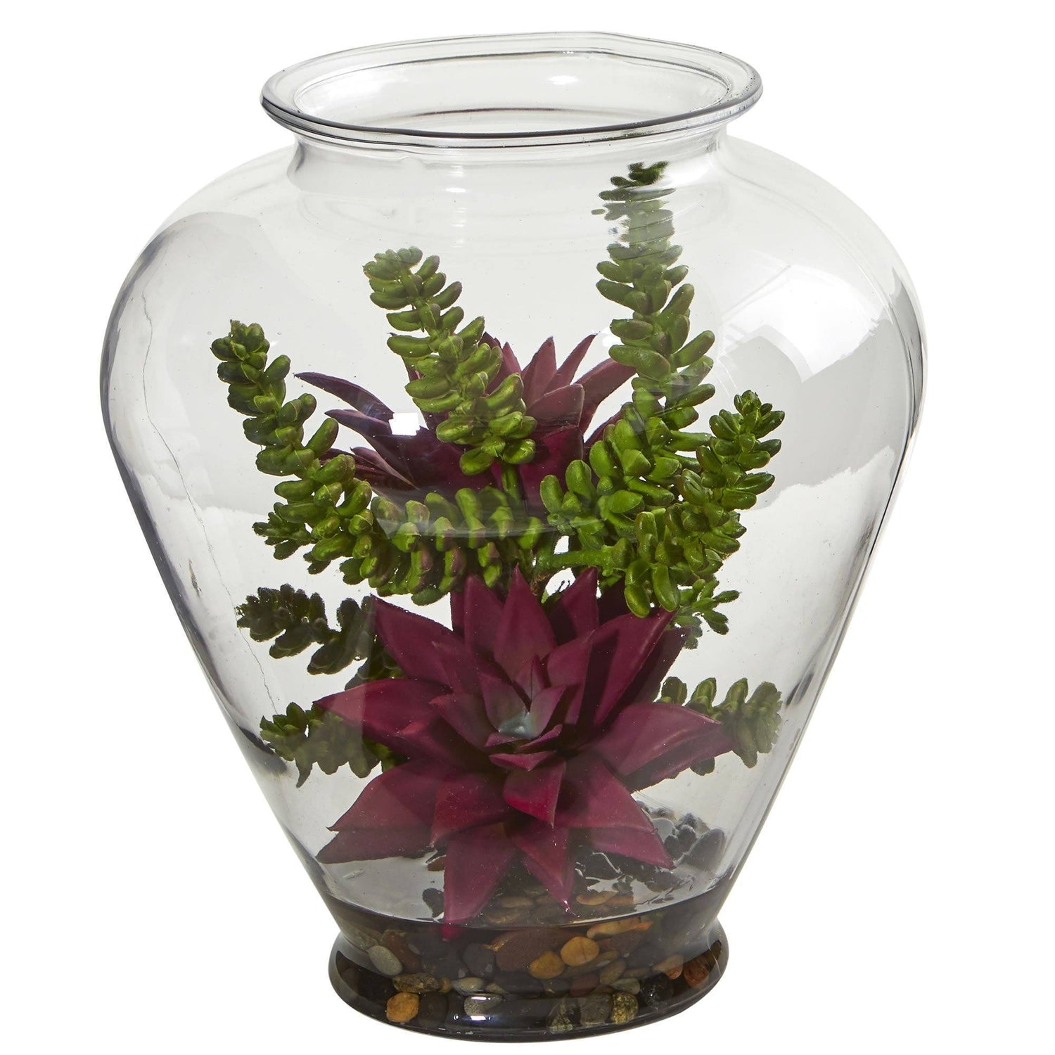 With an ample amount of thick green and burgundy succulents snugly nestled inside the glass vase, this mixed succulent artificial plant flaunts a whimsical look. It's the perfect centerpiece for a formal dining room table or mantelpiece. To complete the look, place it on a mirrored tray with several potted flowering plants for a lovely, elegant finish.