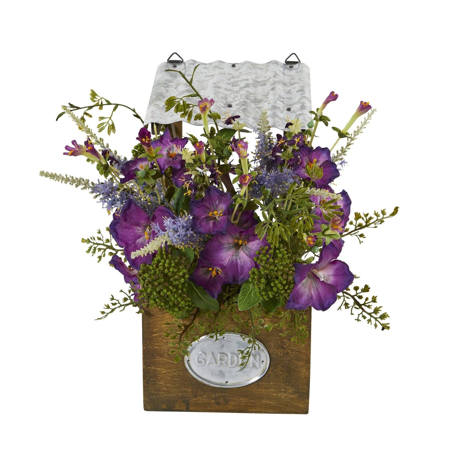 Instantly brighten bare spaces with this artificial arrangement of morning glories boasting naturally occurring details in vibrant hues, delicately nestled amid year-round evergreens. Standing 14” tall from a wooden planter that can be easily displayed (or hung!) anywhere, it showcases natural beauty indoors.