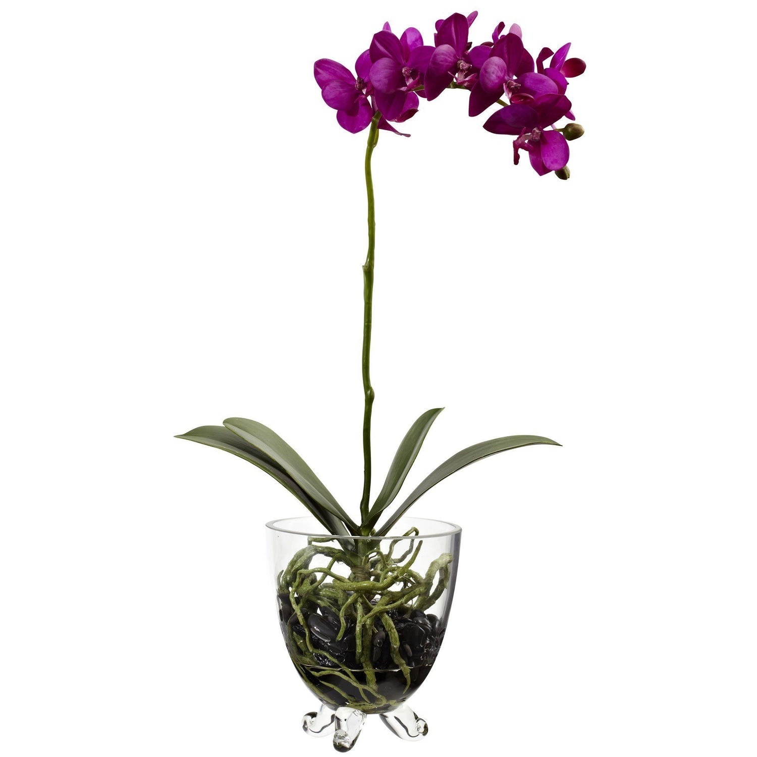 Here’s a simple, yet elegant plant that adds a lively splash of color to any environment. The rich purple flowers create harmony with its single stemmed display, and are further accented by the vibrant coloration of the greenery housed in a modern styled glass vase. Note the delicate root system and black pebbles adorning the vase. Whether using one as a centerpiece, or adding numerous flourishes throughout the home or office, this truly adds a delicate touch.