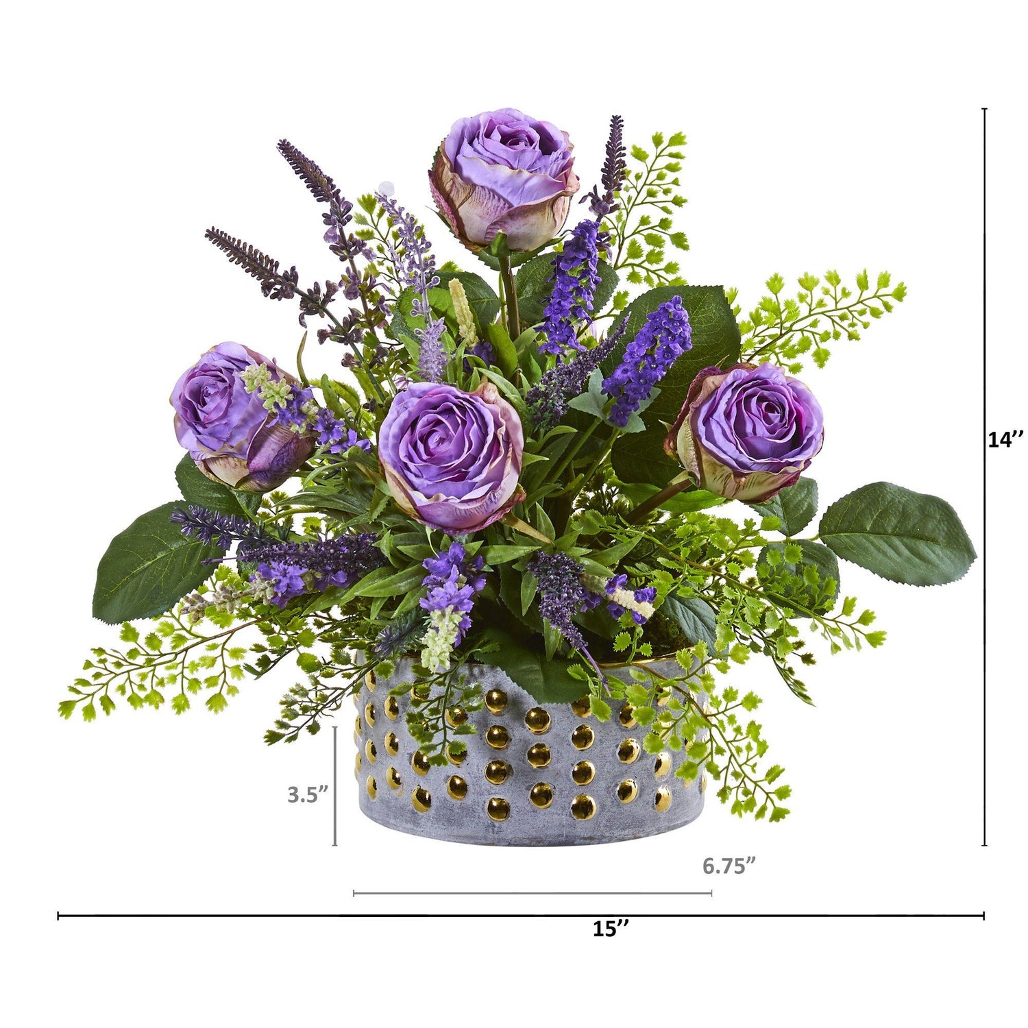 Channel the beauty of the countryside with this artificial arrangement boasting lifelike roses in bright regal hues, beautifully complemented with realistic lavender and a mixed of year-round evergreens. Carefully nestled in a designer vase, this 14” tall arrangement would splash color to brightly lit spaces.