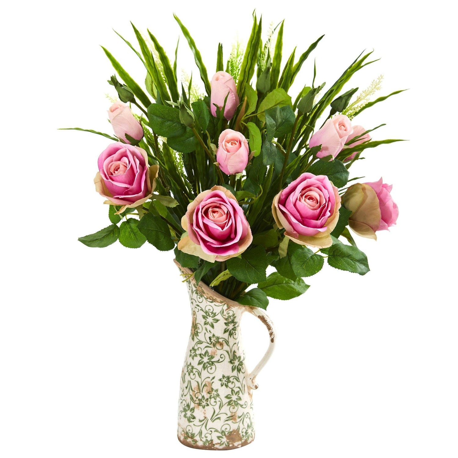 Add dramatic flair to you home interiors with this gorgeous arrangement of artificial roses and vanilla grass. Showcasing a collection of soft floral blossoms set against mixed greens and vanilla grass, it evokes true country romance. Reaching 20” tall from a vase, it would look spectacular on a mantle for an instant splash of color.