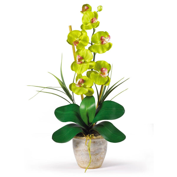 Bursting with color and personality the Phalaenopsis is perhaps the most popular variety of all the orchids. Six lively blooms and two buds are complimented by genuine bamboo, which enhances the silk plant's authenticity. Featuring nearly natural leaves, moss and roots, this familiar favorite is sure to charm the masses.