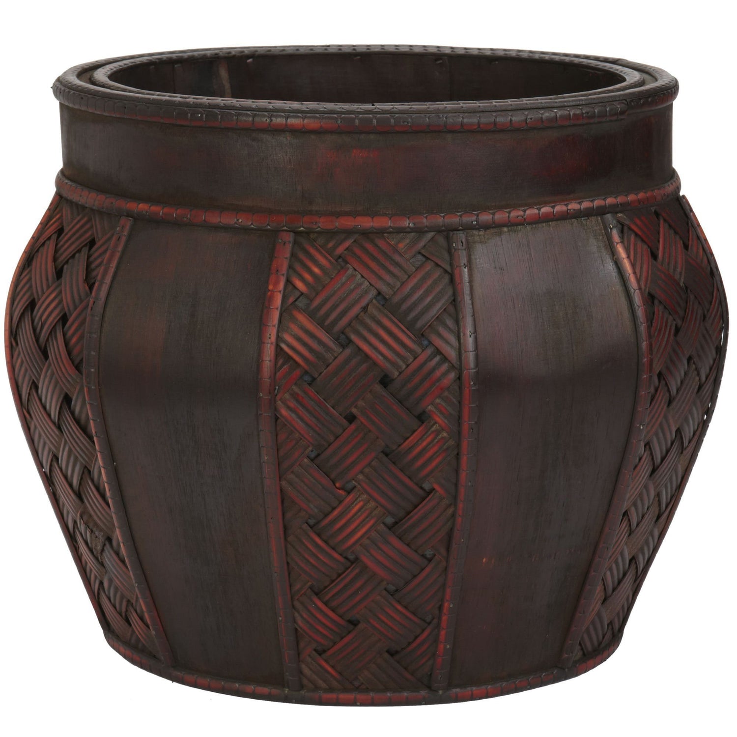 This two-vase collection comes in different sizes for decorating ease. Place your different sized blossoming arrangements or plants to compliment the beauty or just enjoy them on their own anywhere (they’re that pretty). Each vase comes with a dark wine reddish brown finish with enough variation to give it a unique look. Segmented trim separates the tropic inspired cross thatching and smooth leathery looking dark brown background.
