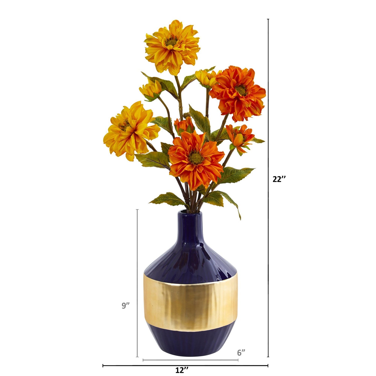 Brighten bare spaces with this artificial arrangement boasting lifelike zinnia floral in bright, cheerful hues and contrasted with dark foliage. Reaching 22” tall from a blue and gold designer vase, it’s a great addition to country-inspired decor.